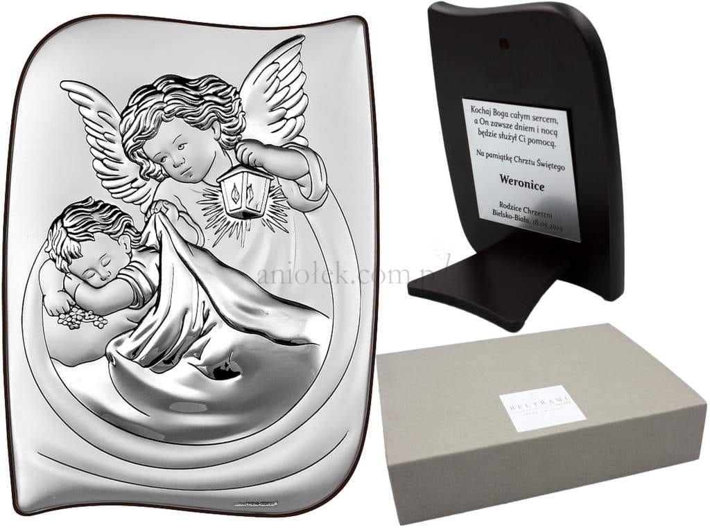 Oferujemy Państwu przepiękny obrazek z wizerunkiem dzieciątka z Aniołem Stróżem u jego boku, w prawej ręce trzyma lampionik, który rozświetla jego przyszłość. Obrazek wyprodukowany jest z wysokiej jakości dwuwarstwowego posrebrzanego aluminium, zaimpregnowany jest lakierem, który daje efekt połysku i blasku na długie lata. Wizerunek umocowany jest na drewnianej podstawie, co daje nam stabilność i trwałość wyrobu.