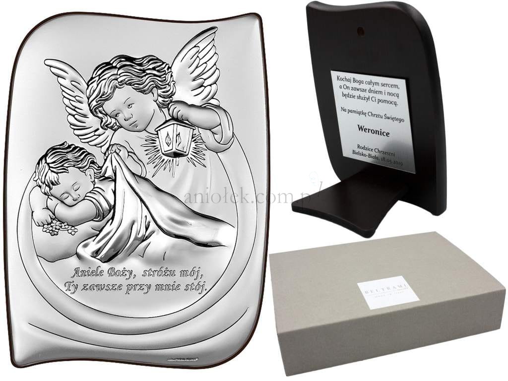 Obrazek srebrny przedstawiający wizerunek Anioła Stróża nad dzieciątkiem z latarenką.