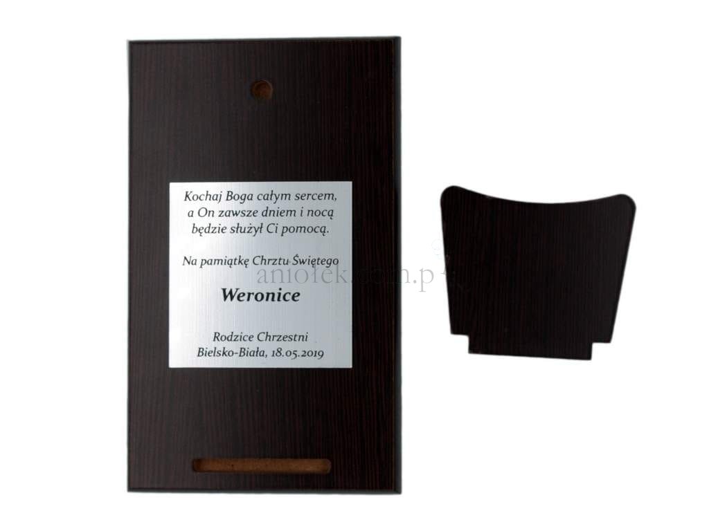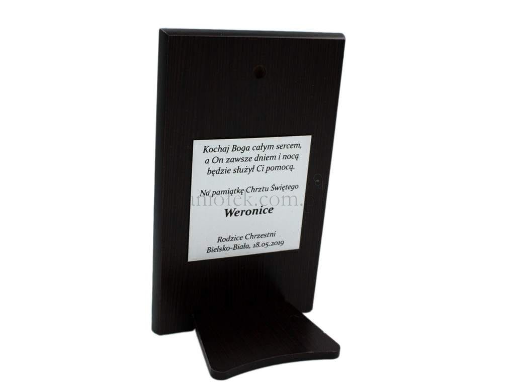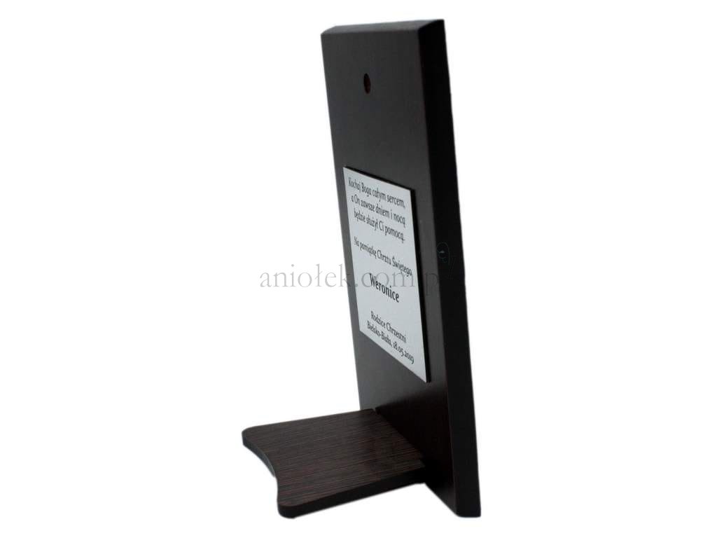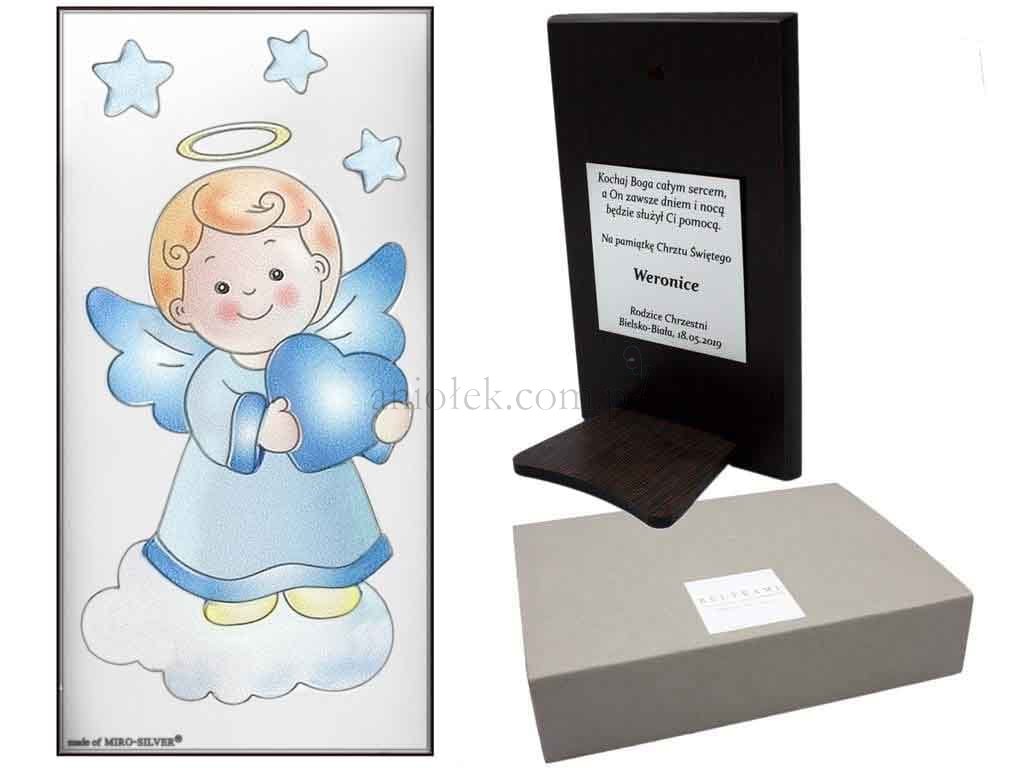Srebrno-niebieska strona obrazka osadzona została na podstawie wykonanej z materiału drewnianego w kolorze ciemnobrązowym. Dołączona do obrazka podstawka umożliwia postawienie tego ślicznego aniołka na półeczce dziecięcej lub w innym miejscu dziecięcego pokoju.