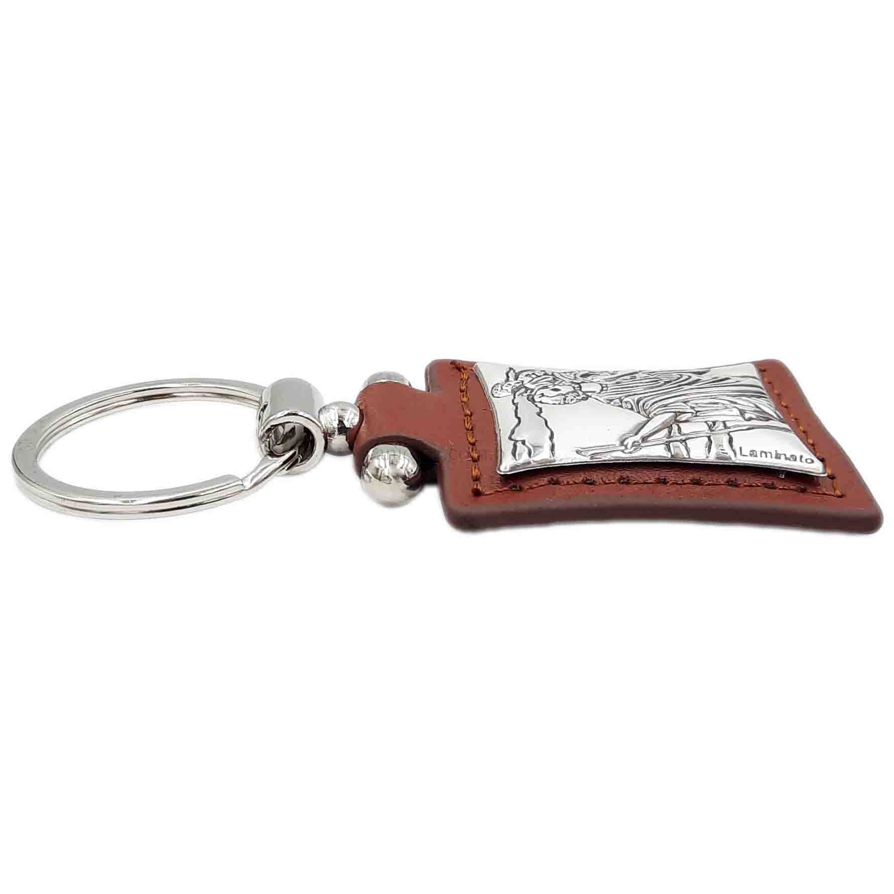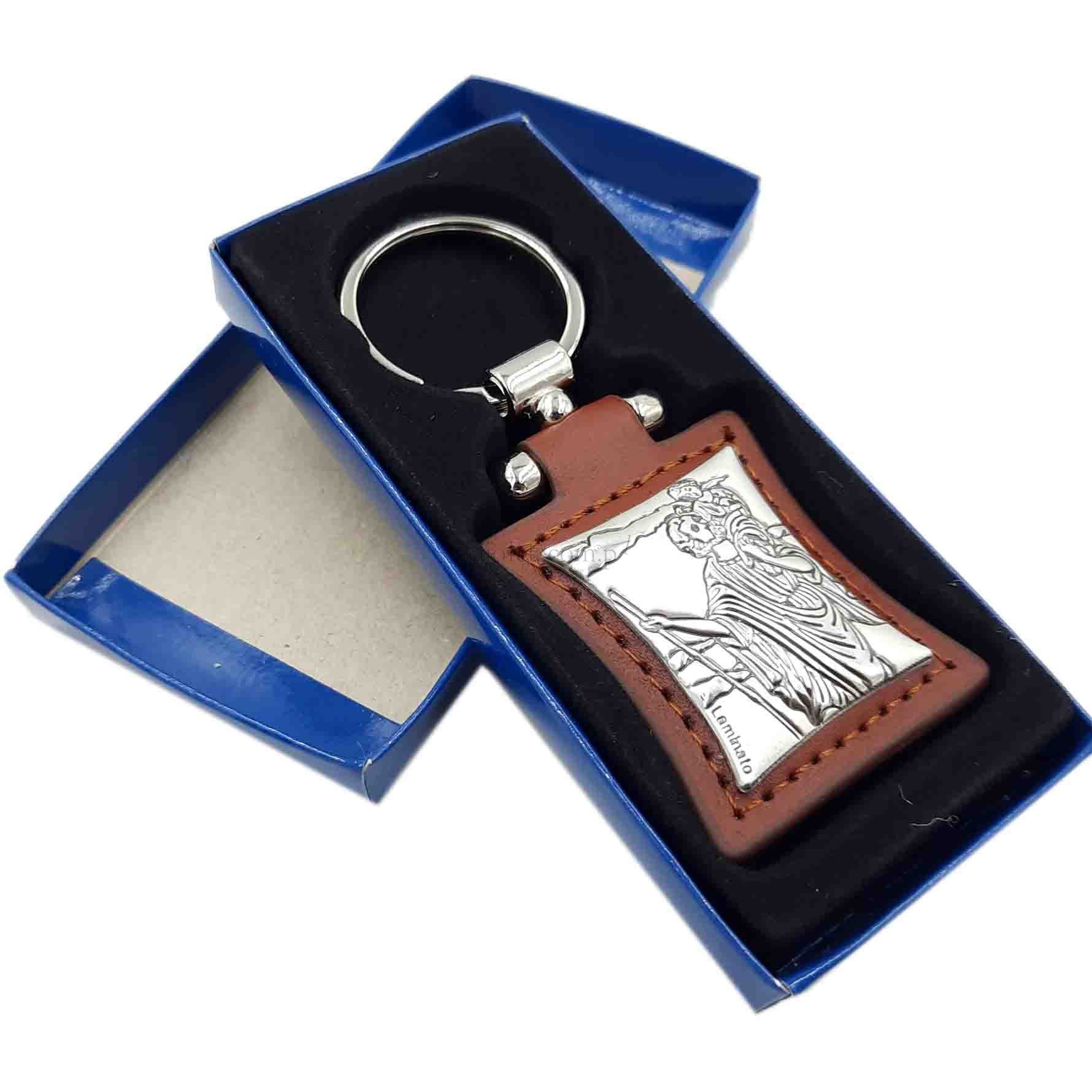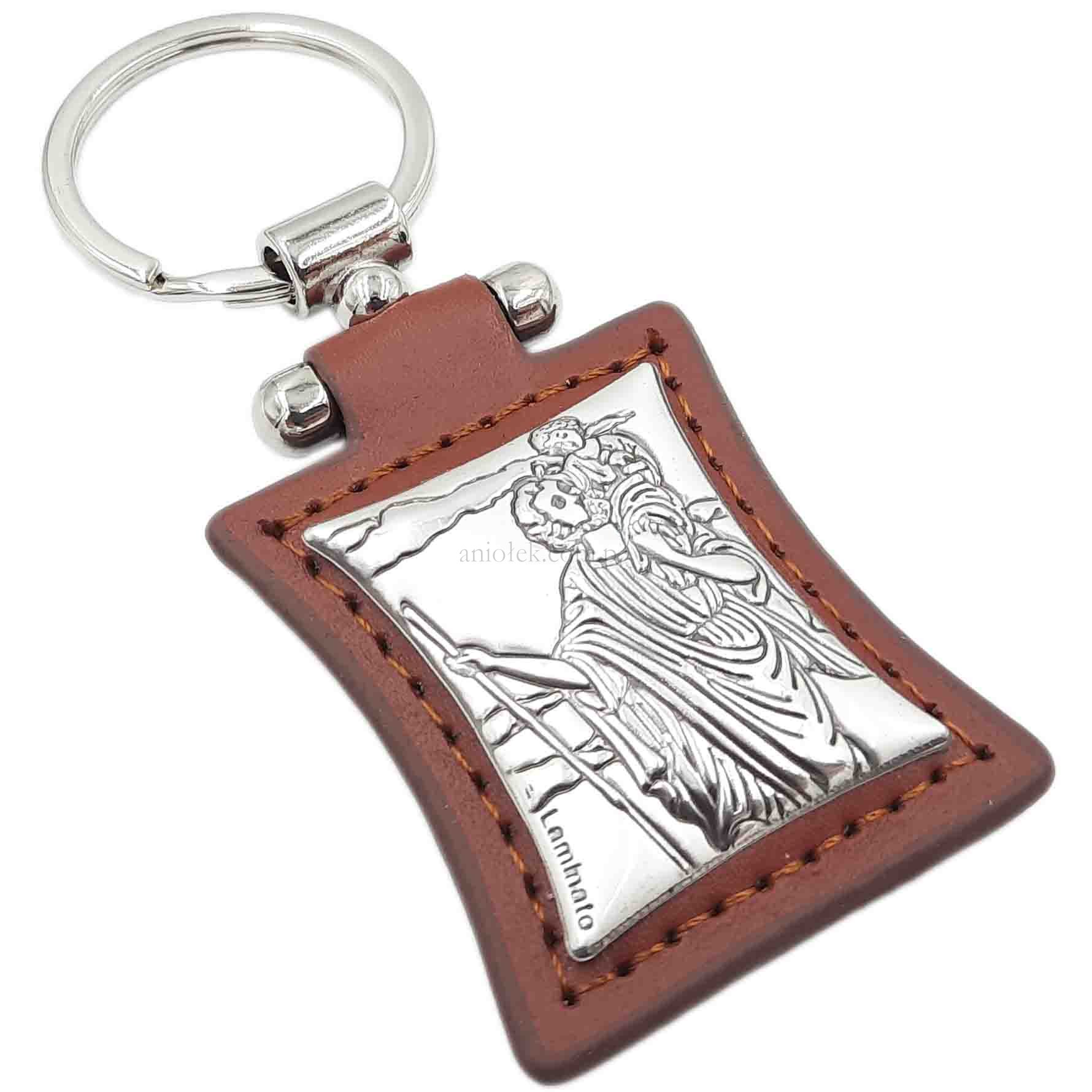 Brelok srebrzony Św. Krzysztof skórka brąz