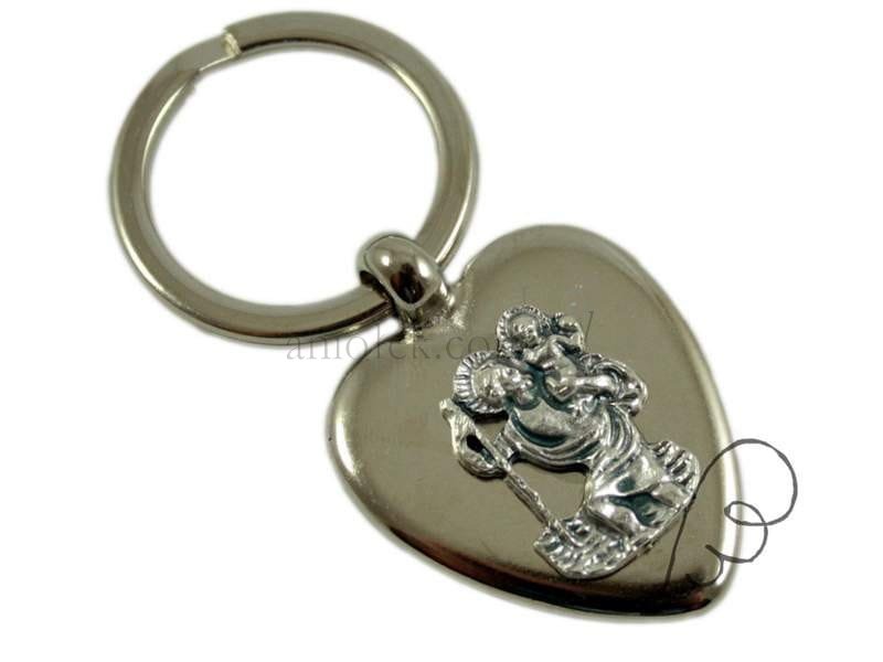 Brelok do kluczy, na którym przedstawiono wizerunek św. Krzysztofa - patrona kierowców i podróżnych.