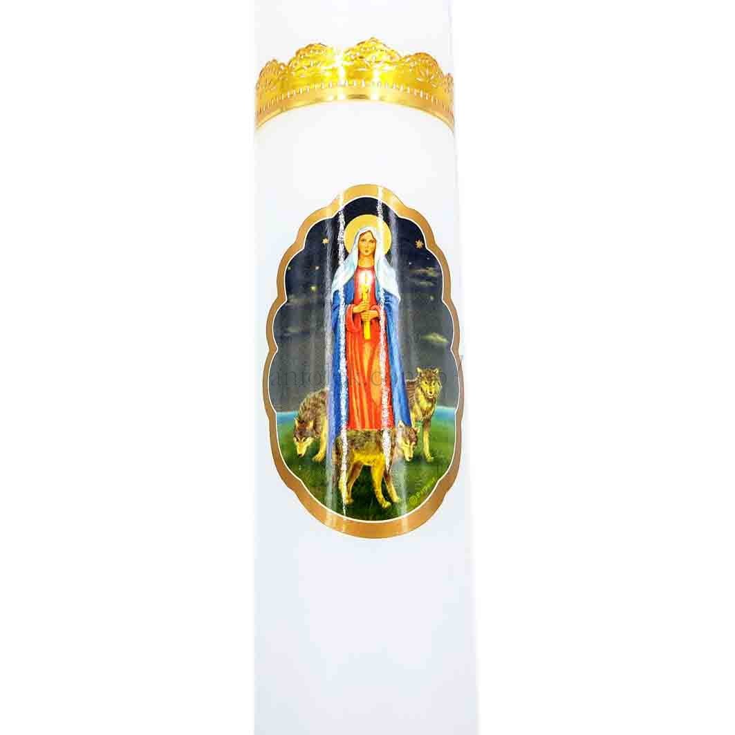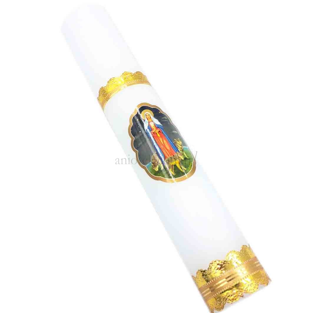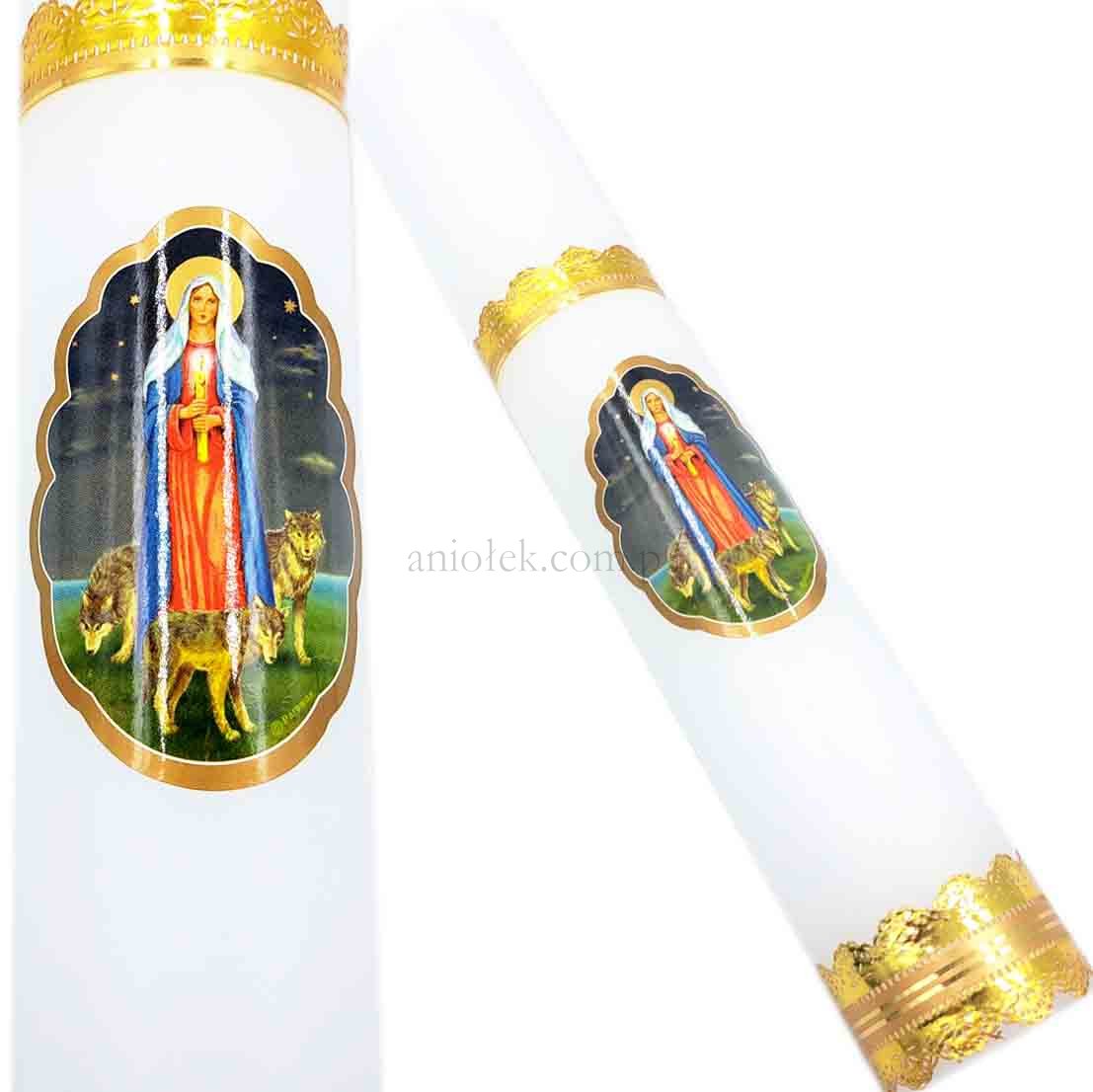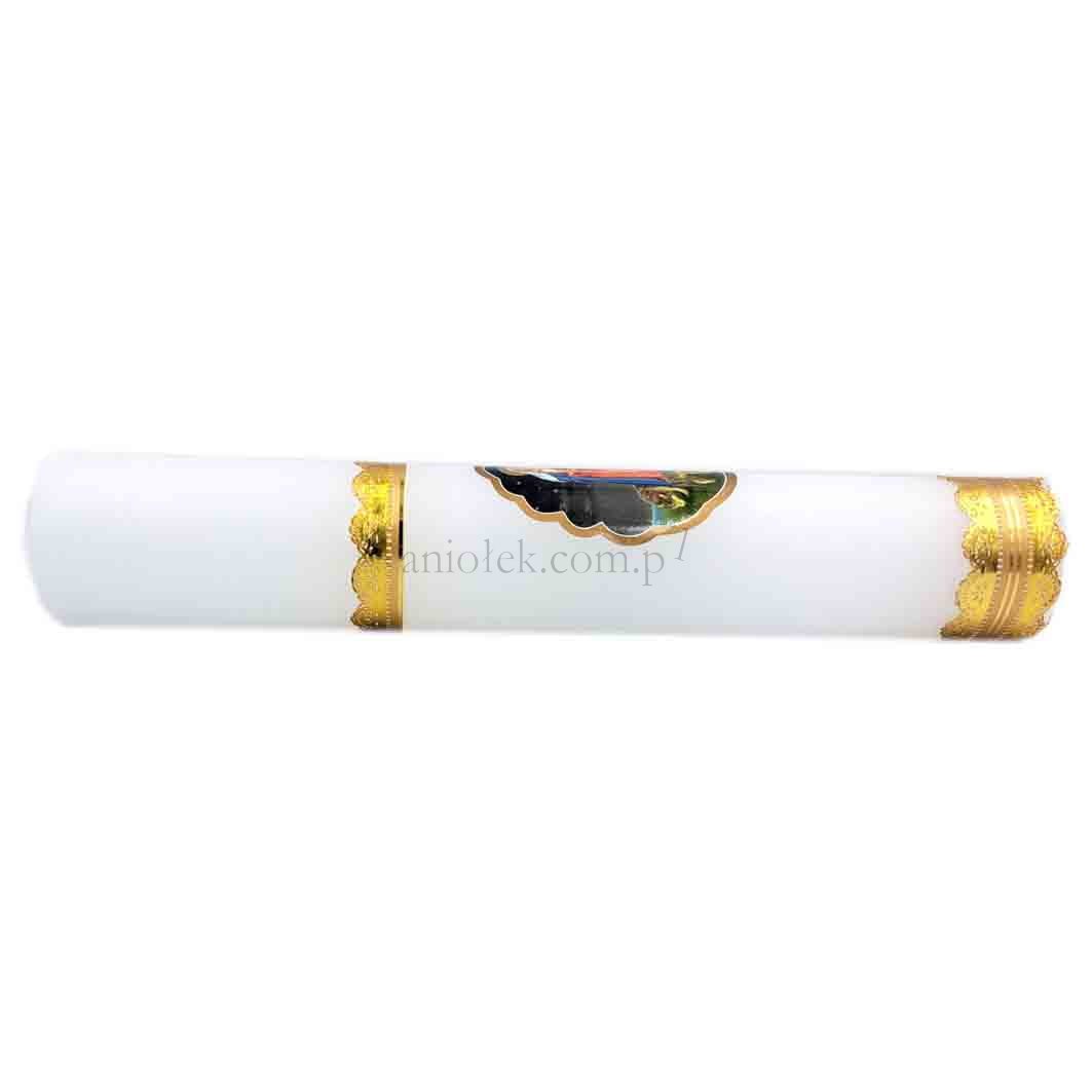 Na świecy klejony wizerunek Matki Boskiej Gromnicznej. Średnica gromnicy - 4,5 cm