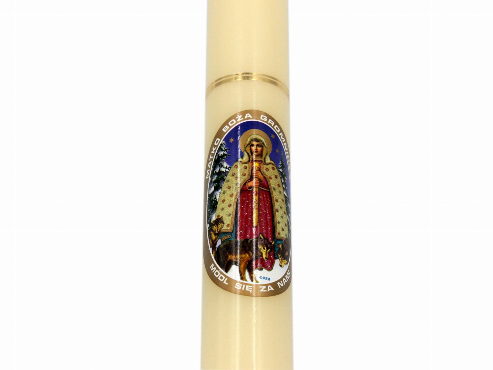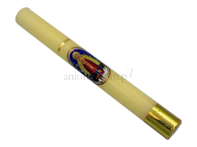 Na świecy klejony wizerunek Matki Boskiej Gromnicznej z wilkami. Średnica gromnicy - 3 cm