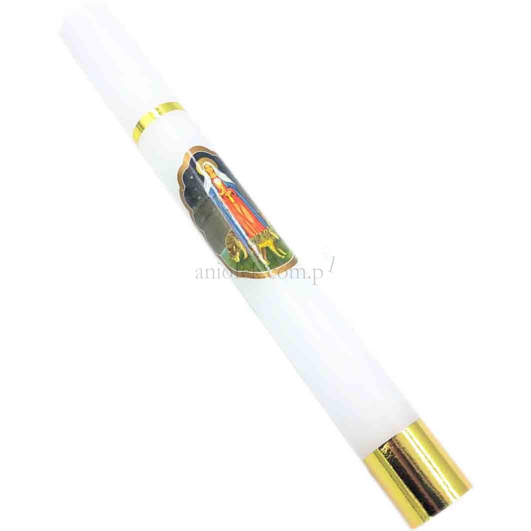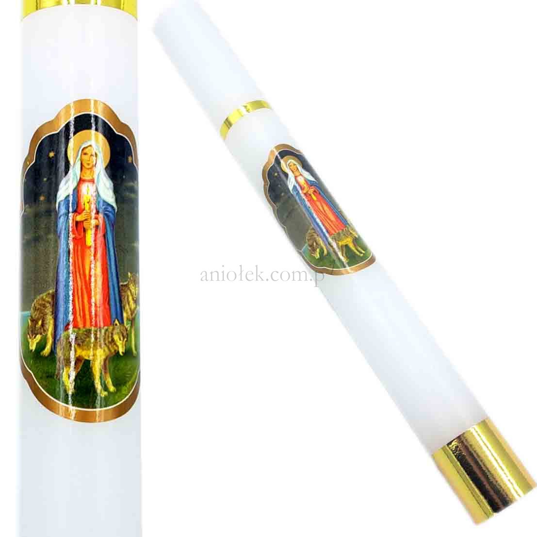 Gromnica parafinowa w kolorze białym ze złotymi zdobieniami oraz wizerunkiem Matki Boskiej Gromnicznej.