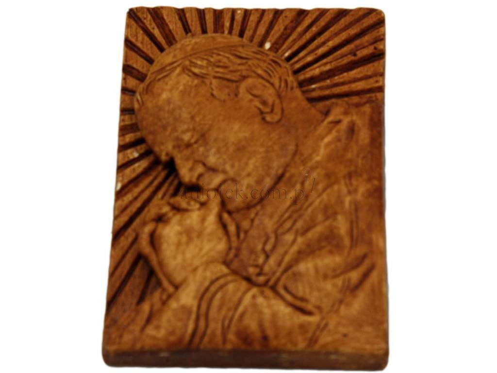 Relief gipsowy stylizowany na produkt drewniany z wizerunkiem Świętego Jana Pawła II.