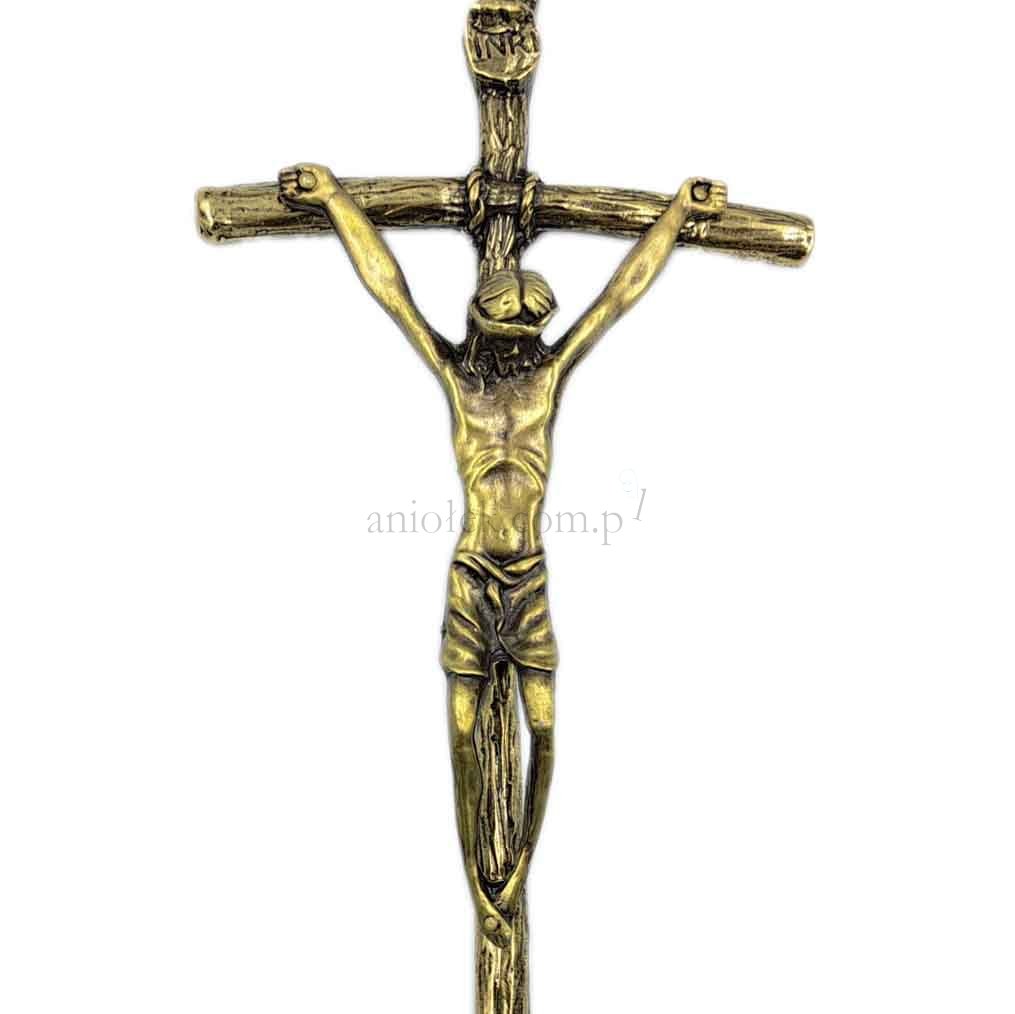 Krzyż został starannie wykonany z metalu przez polskiego producenta, co gwarantuje jego wysoką jakość i trwałość. Dbale wykonane detale oraz precyzyjne wykończenie nadają mu elegancki wygląd.