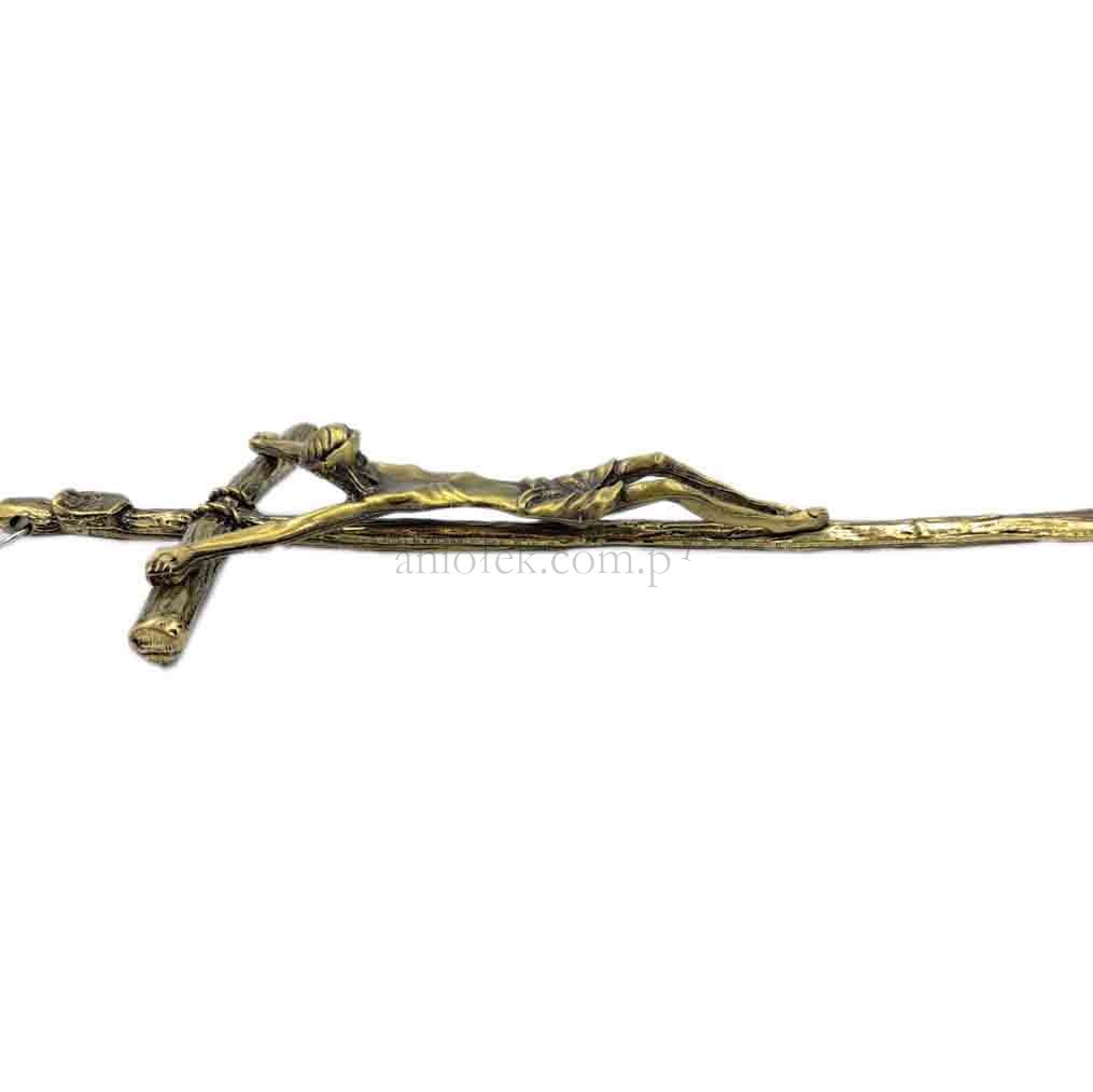 Ten krzyż jest wyraźnym i doniosłym elementem dekoracyjnym na ścianie. Jego złoty kolor dodaje mu wyjątkowego blasku i uroku, przyciągając uwagę każdego, kto przechodzi obok.