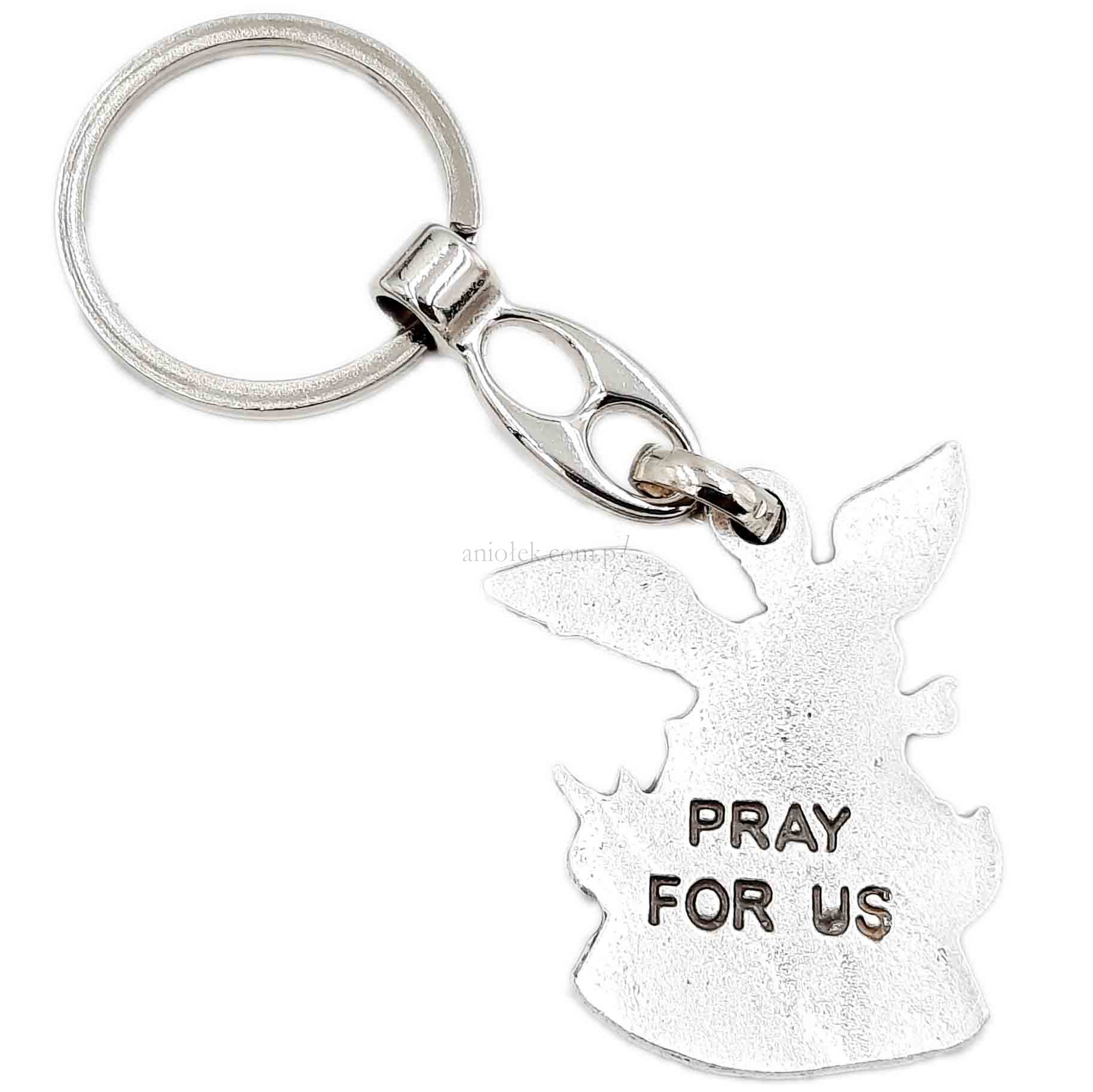 Na rewersie breloczka wytłoczono napis "Pray for Us".