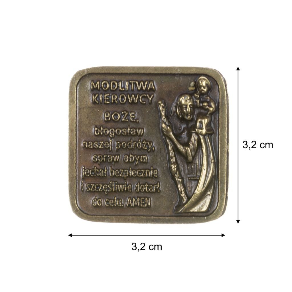 ✅wizerunek opiekuna podróżujących - Metalowa plakietka ozdobiona jest wizerunkiem św. Krzysztofa, patrona podróżujących. Jego obecność symbolizuje ochronę i bezpieczeństwo w trakcie podróży.