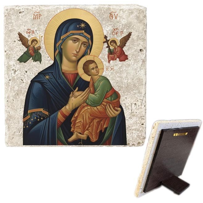 Wyjątkowy obrazek z wizerunkiem Matki Bożej Nieustającej Pomocy, wykonany na materiale imitującym kamień. Każdy egzemplarz jest niepowtarzalny, ponieważ naturalne nierówności i struktura podstawy sprawiają, że nie ma dwóch identycznych obrazków.