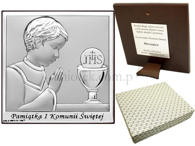 Włoski obrazek srebrzony z wizerunkiem pierwszokomunijnym.