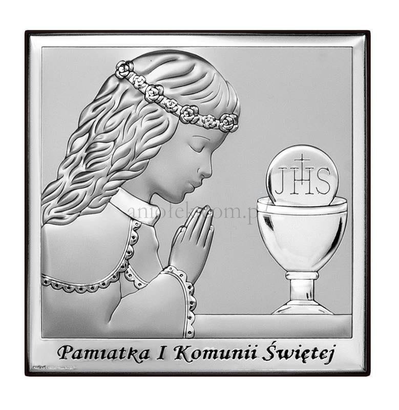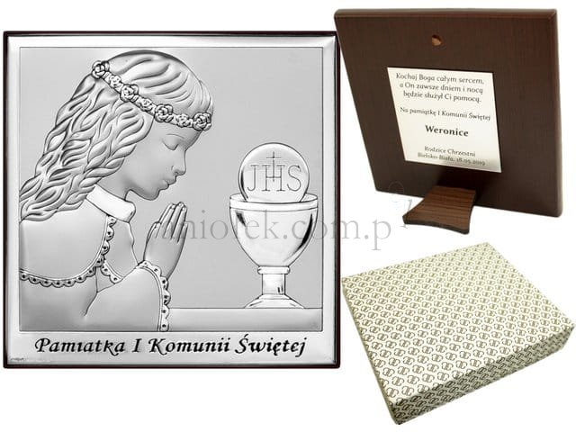 Włoski obrazek srebrzony z wizerunkiem pierwszokomunijnym.