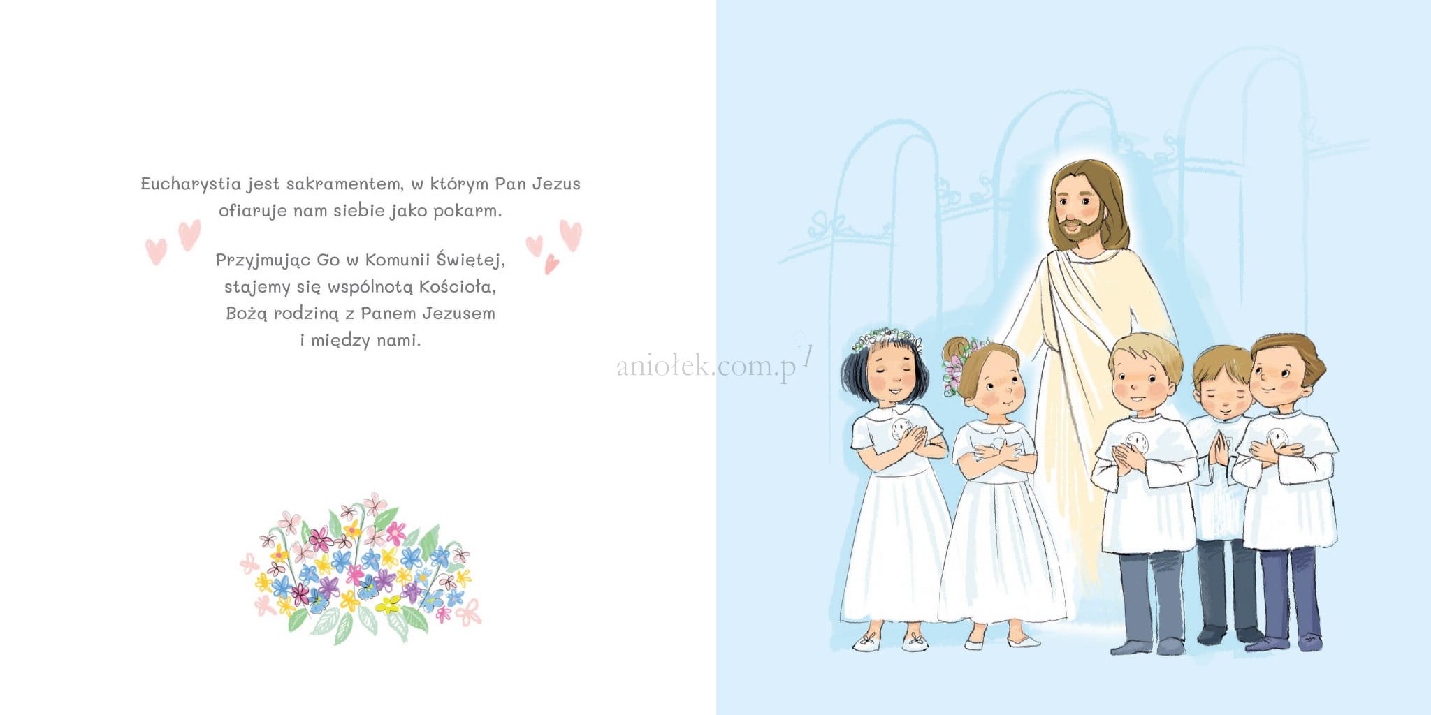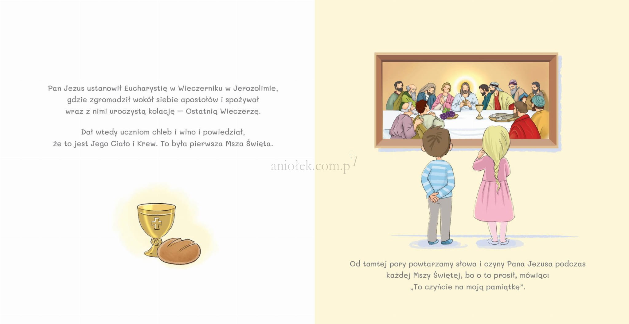 Publikacja w przystępny sposób ukazuje znaczenie Eucharystii jako najważniejszego spotkania chrześcijan z Panem Jezusem. Dziecko dowiaduje się, że to właśnie podczas Mszy Świętej Jezus mówi do nas przez słowa Pisma Świętego i karmi nas w Komunii.