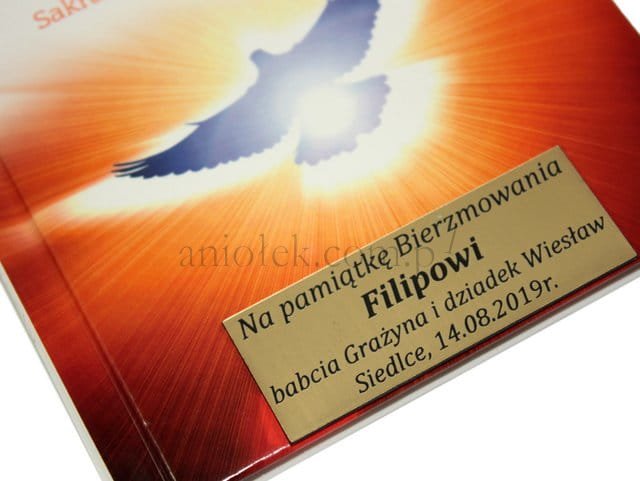 Pamiątka z grawerowaną dedykacją na okładce.