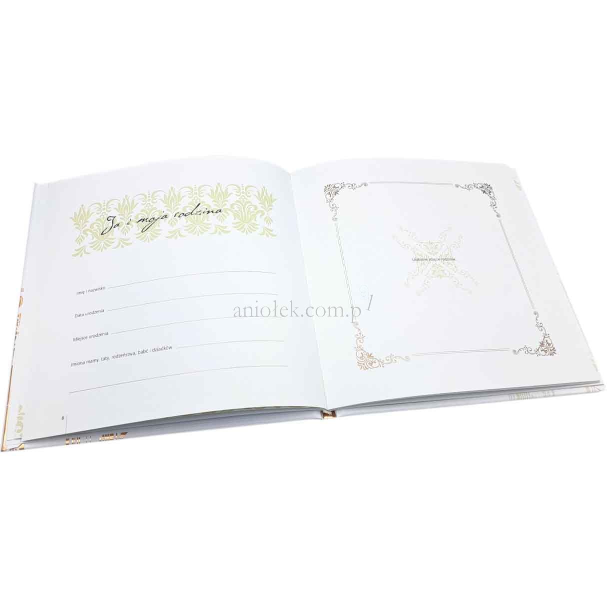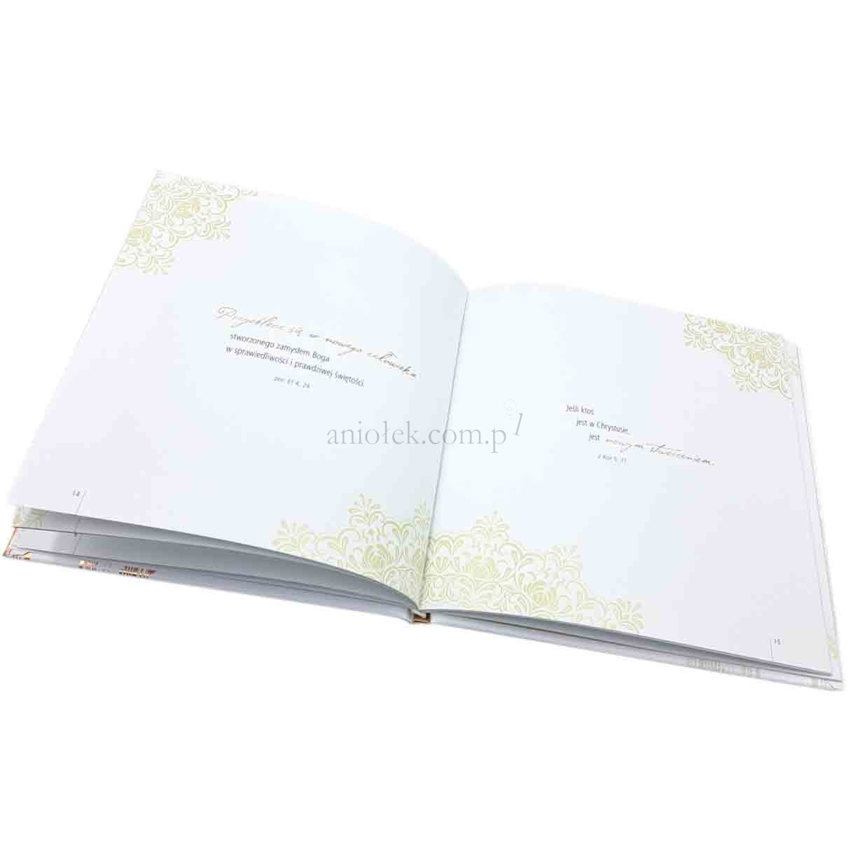 Wnętrze książeczki wypełnione jest wartościową treścią, w tym cytatami z Pisma Świętego, myślami papieży: św. Jana Pawła II, Benedykta XVI, Franciszka, a także inspirującymi słowami różnych osób świętych. Album zawiera także miejsce na życzenia, strony przeznaczone na pamiątkowe fotografie, miejsce na wpisanie istotnych informacji związanych z uroczystością oraz kopertę na dodatkowe wspomnienia.