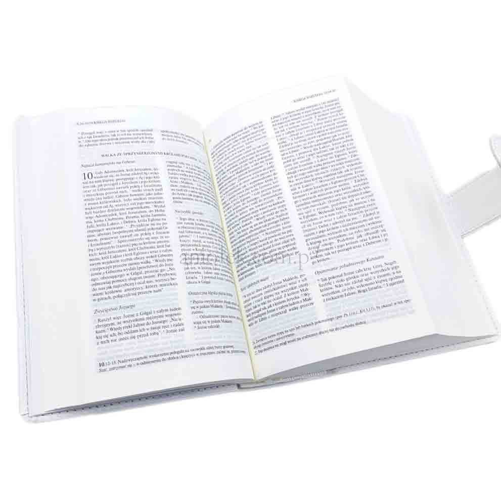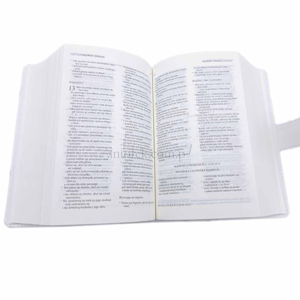 Biblia Poznańska to jednotomowa edycja Pisma Świętego, która zyskała powszechne uznanie dzięki doskonałemu przekładowi oraz wstępom i komentarzom autorów. Wydanie jest pięknie oprawione w białą ekoskórę z złotymi napisami i zamykane na magnes. Na wewnętrznej stronie okładki można zamieścić grawerowaną dedykację, wykonaną według życzenia.