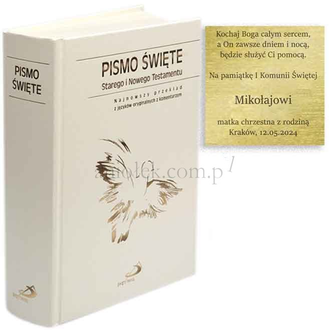 - Gratisowa tabliczka z tekstem dedykacji - Dodatkowo, do każdego egzemplarza Pisma Świętego dołączamy grawerowaną tabliczkę z dowolnym tekstem dedykacji. To szczególnie polecane na I Komunię Świętą i Bierzmowanie, dodając osobisty akcent do tego wyjątkowego prezentu.