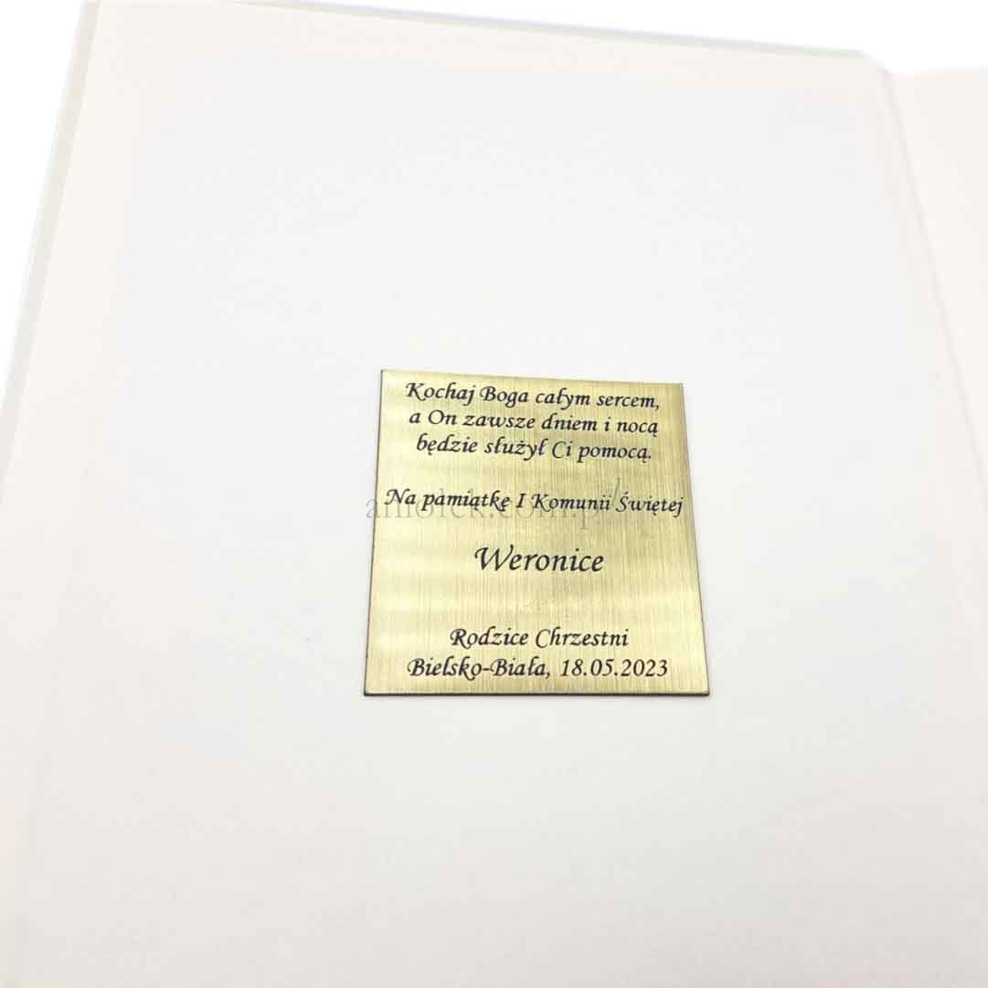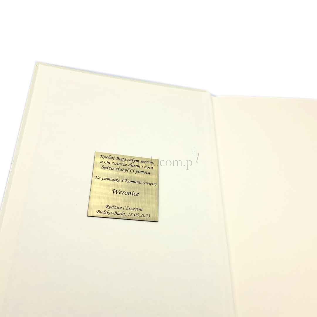 Do Pisma Świętego dołączamy tabliczkę z grawerowaną dedykacją, którą umieścimy na wewnętrznej stronie okładki publikacji.