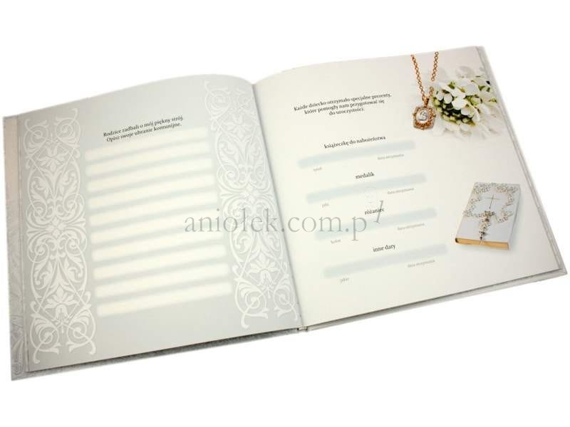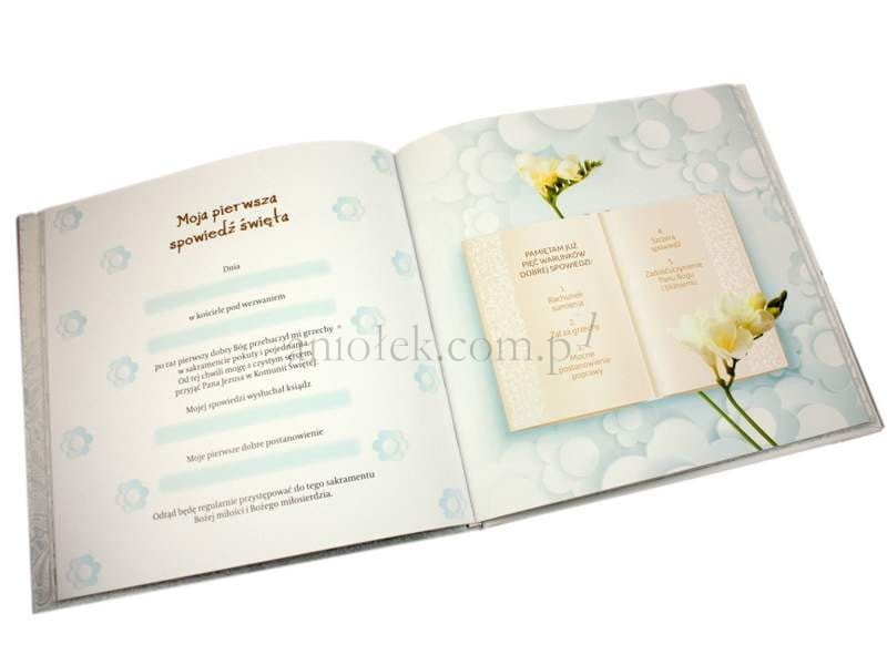 Dzień, kiedy dziecko po raz pierwszy przyjmuje do serca Pana Jezusa, jest wyjątkowy i niepowtarzalny. Oczekiwany i bardzo uroczysty. Z myślą o zatrzymaniu tych chwil na długie lata przygotowaliśmy album, który stanie się cenną i pielęgnowaną pamiątką w niejednym domu. Dostarczy wielu wzruszeń i autentycznych emocji. Znajdziemy w nim m.in. miejsce na wpisanie życzeń z okazji przystąpienia do sakramentu od gości, wklejenie zdjęć z uroczystości czy wpisanie jej daty. Oprócz tego jest miejsce na wynotowanie ulubionych przedmiotów szkolnych i zabaw dziecka. Ukochanych modlitw i pieśni religijnych czy terminu pierwszej spowiedzi świętej.