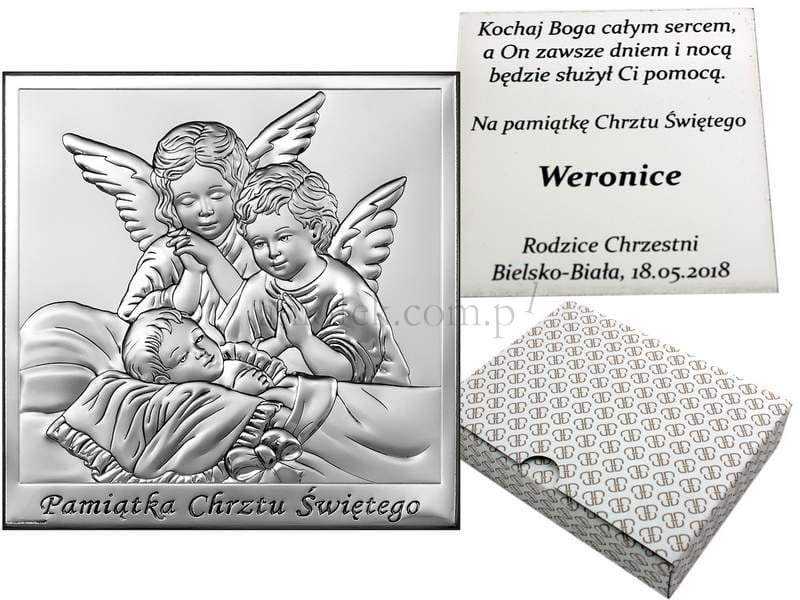 Obrazek srebrny przedstawiający wizerunek Anioła Stróża nad dzieckiem.