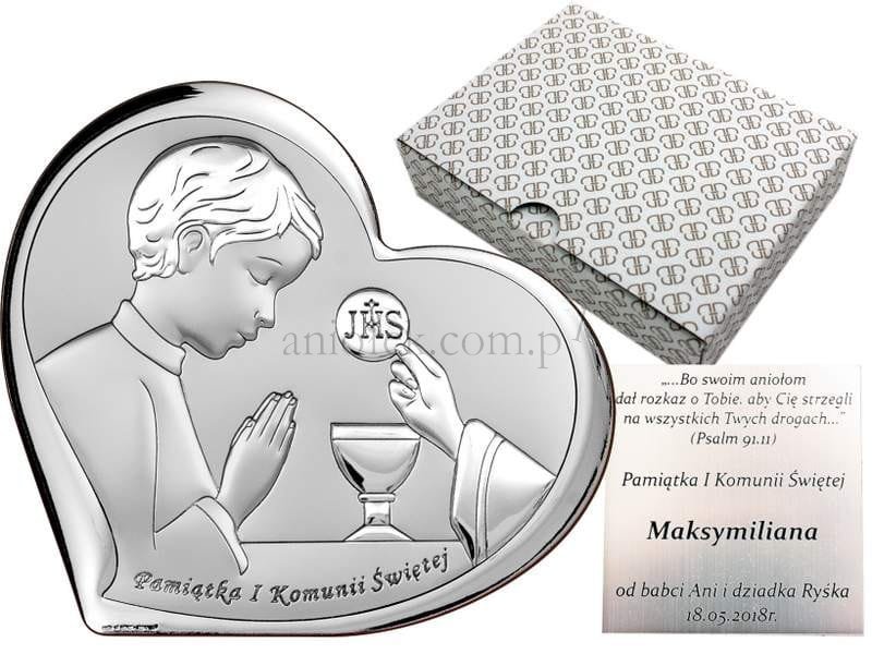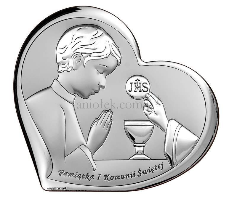 Obrazek srebrny przedstawiający wizerunek modlącego się chłopca przyjmującego Pierwszą Komunię Świętą oraz napisem.