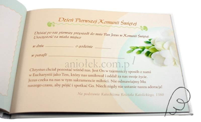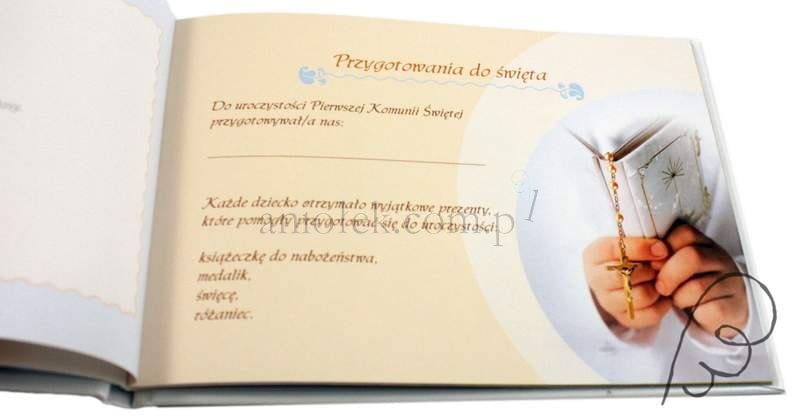 W uroczystym dniu Pierwszej Komunii Świętej pragniemy obdarować nasze dzieci wyjątkowymi prezentami. Jednym z nich może być ten pamiątkowy album, w którym jest miejsce na dedykację i płynące z głębi serca życzenia. Album pozwoli dziecku zapamiętać ten radosny dzień spotkania z Jezusem. Wydany został w dwóch wersjach: z okładką dla dziewczynek i dla chłopców.