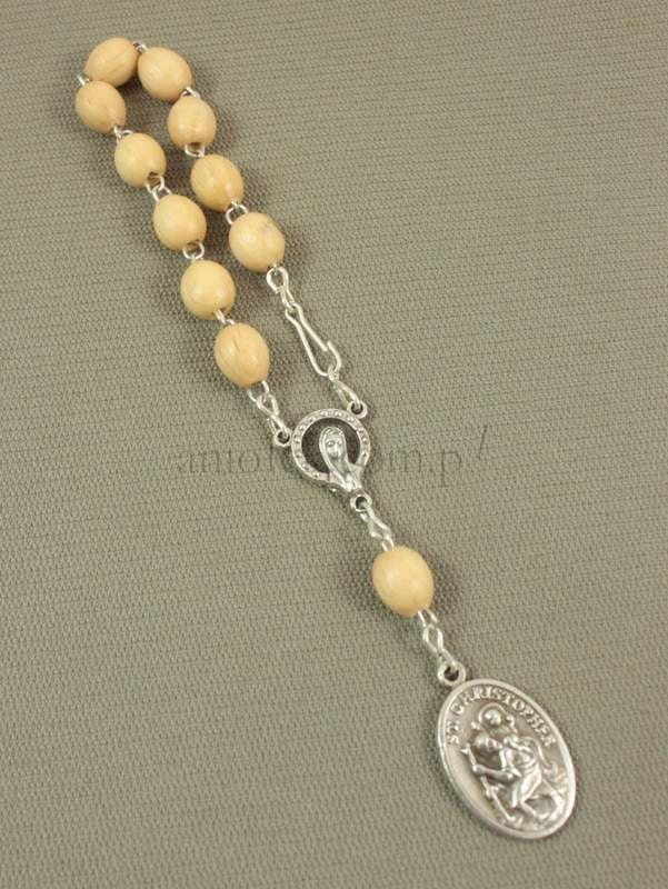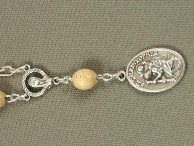 Różaniec na metalowym łańcuszku z medalikiem Świętego Krzysztofa.