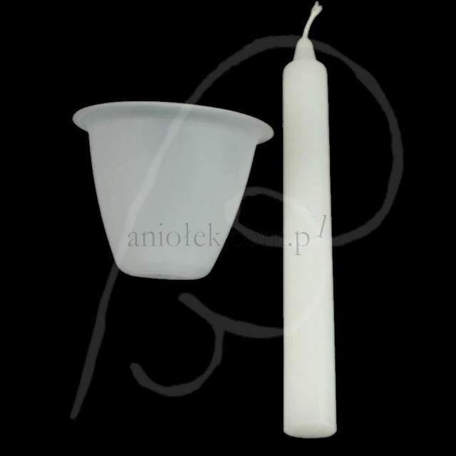 Zestaw złożony z niewielkiej białej świeczki oraz plastikowego lampionika.