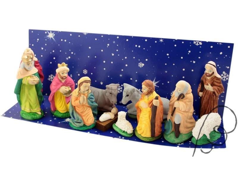 Komplet gipsowych figurek do szopki bożonarodzeniowej. 11 figurek cechujących się żywą kolorystyką.