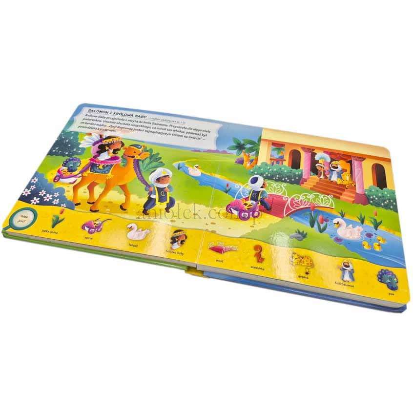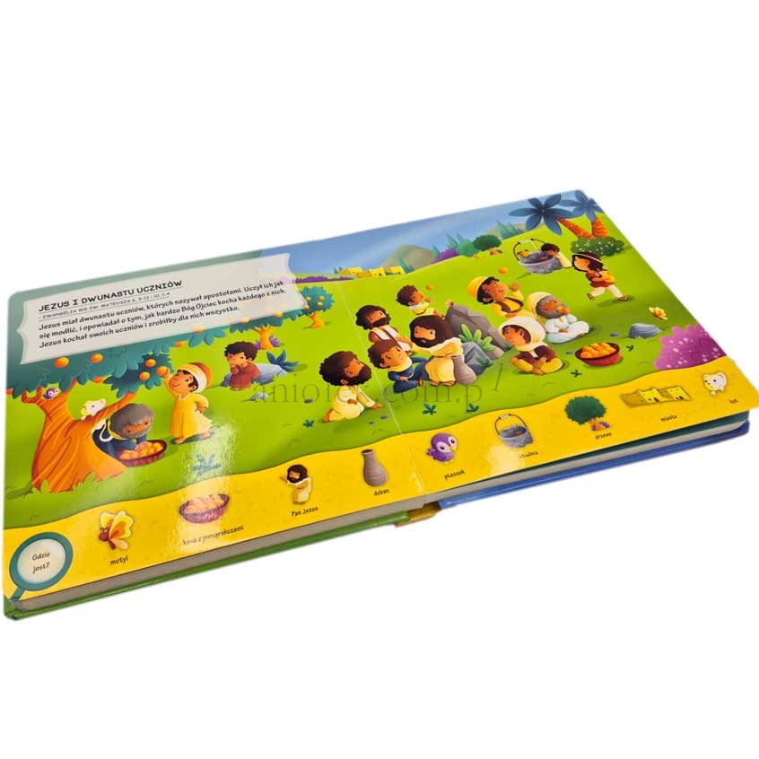 Na każdej stronie dzieci mogą odnaleźć aż 190 różnych obiektów, ćwicząc spostrzegawczość i skupienie, jednocześnie poznając najważniejsze wydarzenia ze Starego i Nowego Testamentu.
