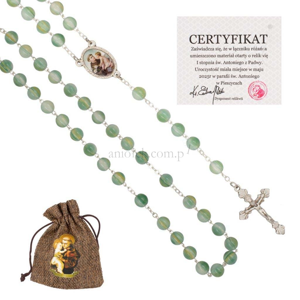 Piękny różaniec–koronka poświęcona św. Antoniemu z Padwy. Wykonany został z paciorków w odcieniach zieleni, które mienią się subtelnie, nadając mu wyjątkowego i eleganckiego charakteru.