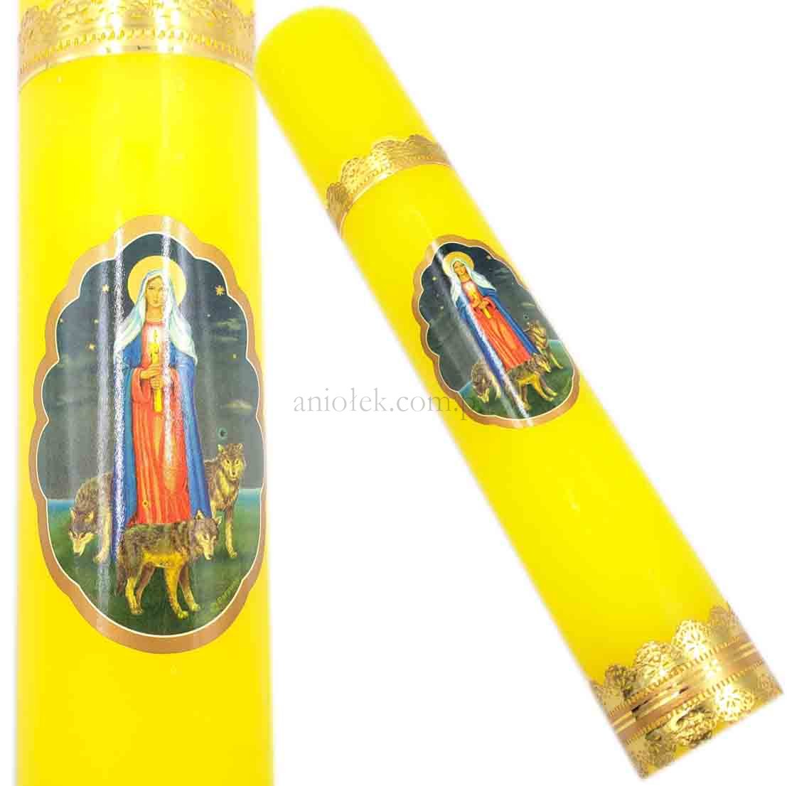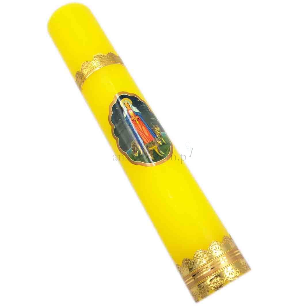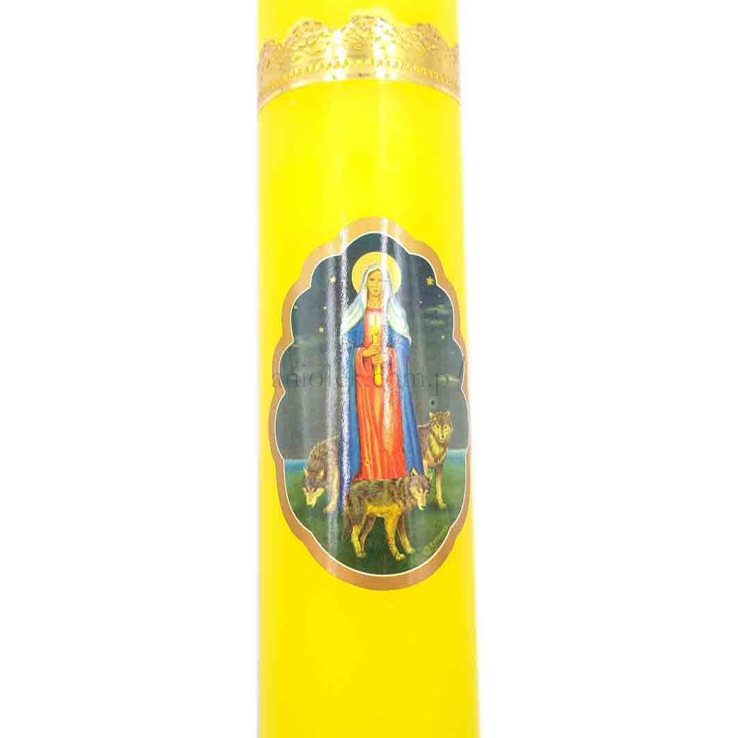Na świecy klejony wizerunek Matki Boskiej Gromnicznej. Średnica gromnicy - 4,5 cm