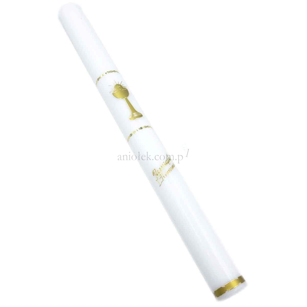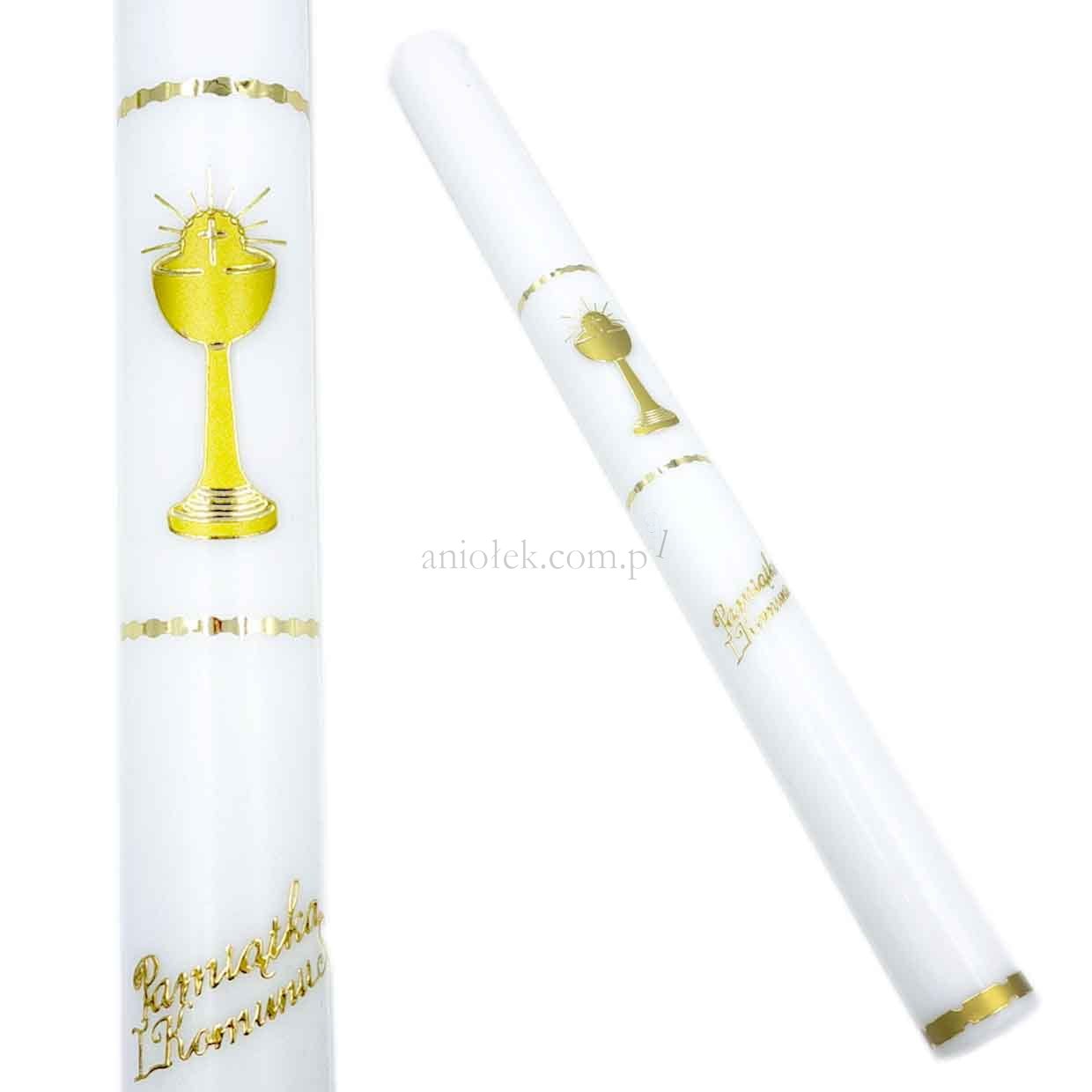 Świeca ozdobiona złotymi elementami oraz napisem "Pamiątka Pierwszej Komunii Świętej".