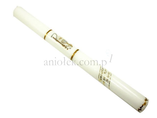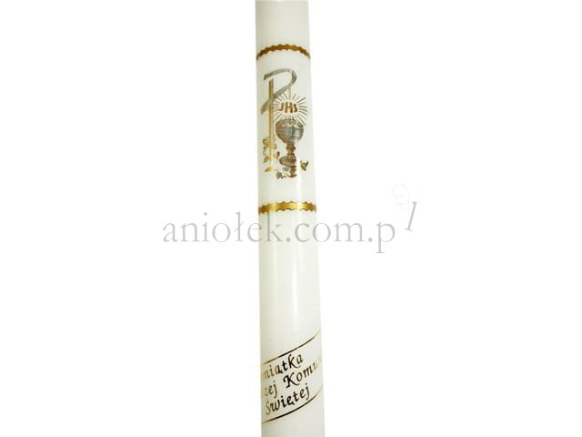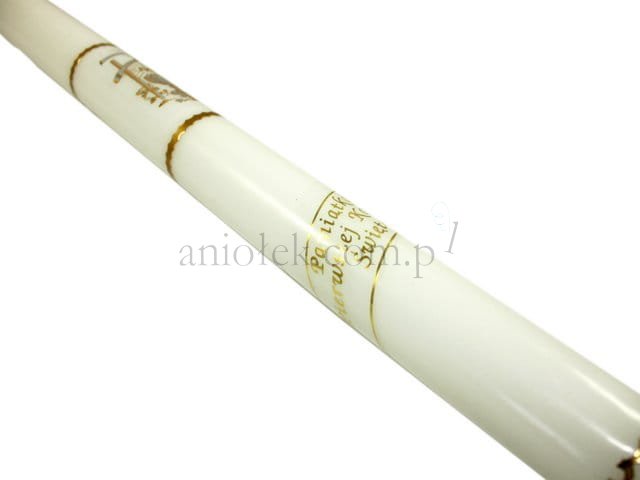 Świeca ozdobiona złotymi elementami oraz napisem "Pamiątka Pierwszej Komunii Świętej".