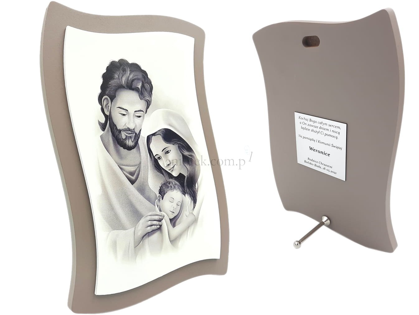 Czarno biały wizerunek Świętej Rodziny na podstawie z materiału drewnianego. Dołączona do produktu metalowa nóżka umożliwi postawienie tego pięknego wizerunku.