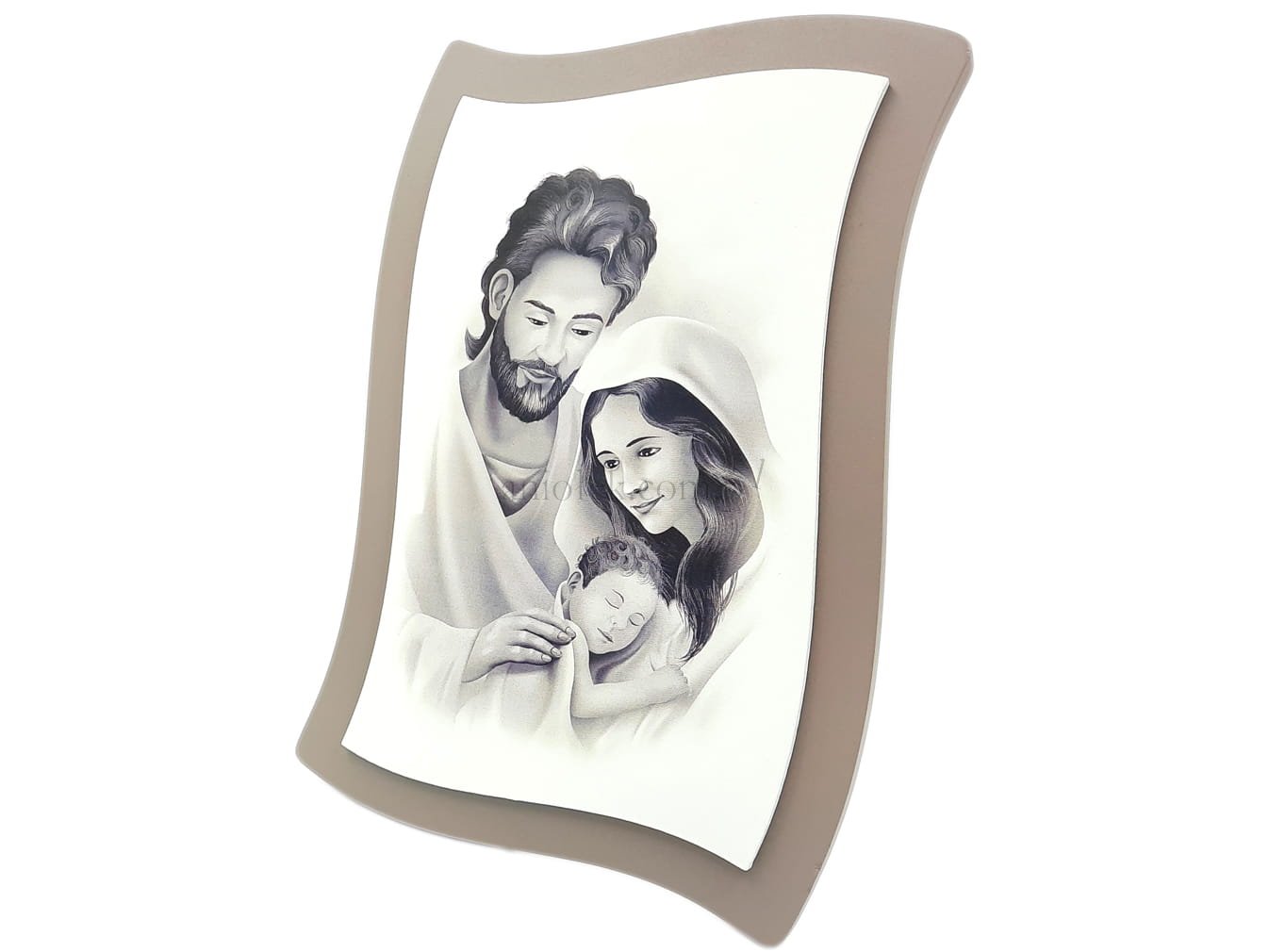 Czarno biały wizerunek Świętej Rodziny na podstawie z materiału drewnianego. Dołączona do produktu metalowa nóżka umożliwi postawienie tego pięknego wizerunku.