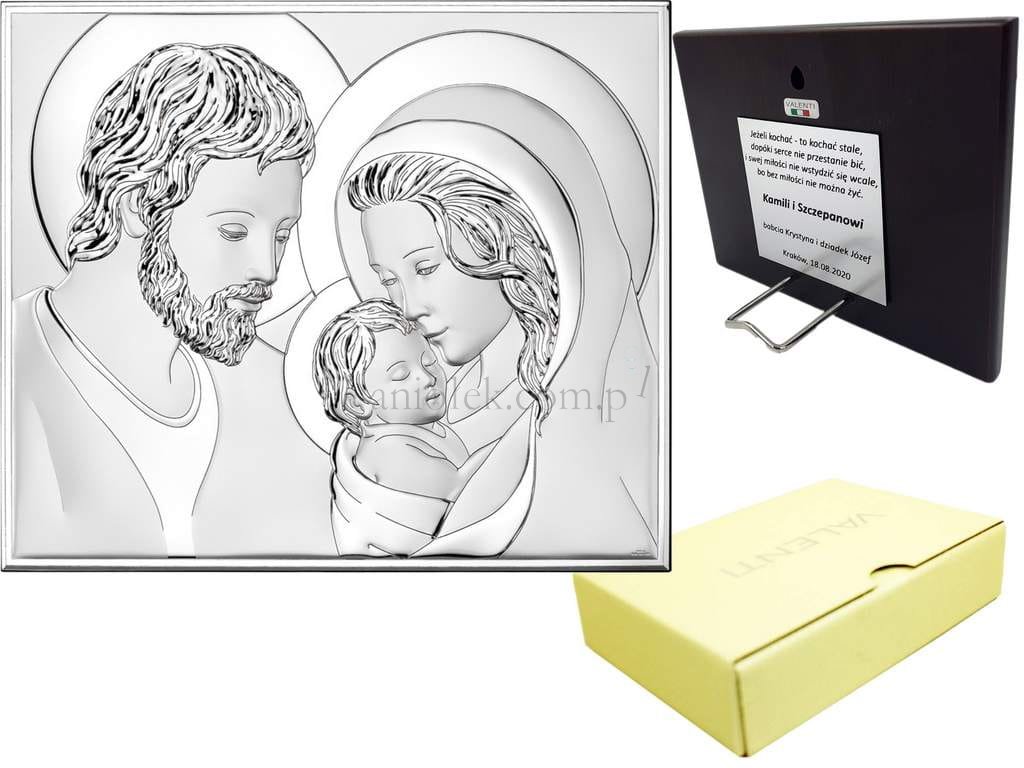 Srebrzony wizerunek Świętej Rodziny 15 x 12 cm z personalizowaną dedykacją.