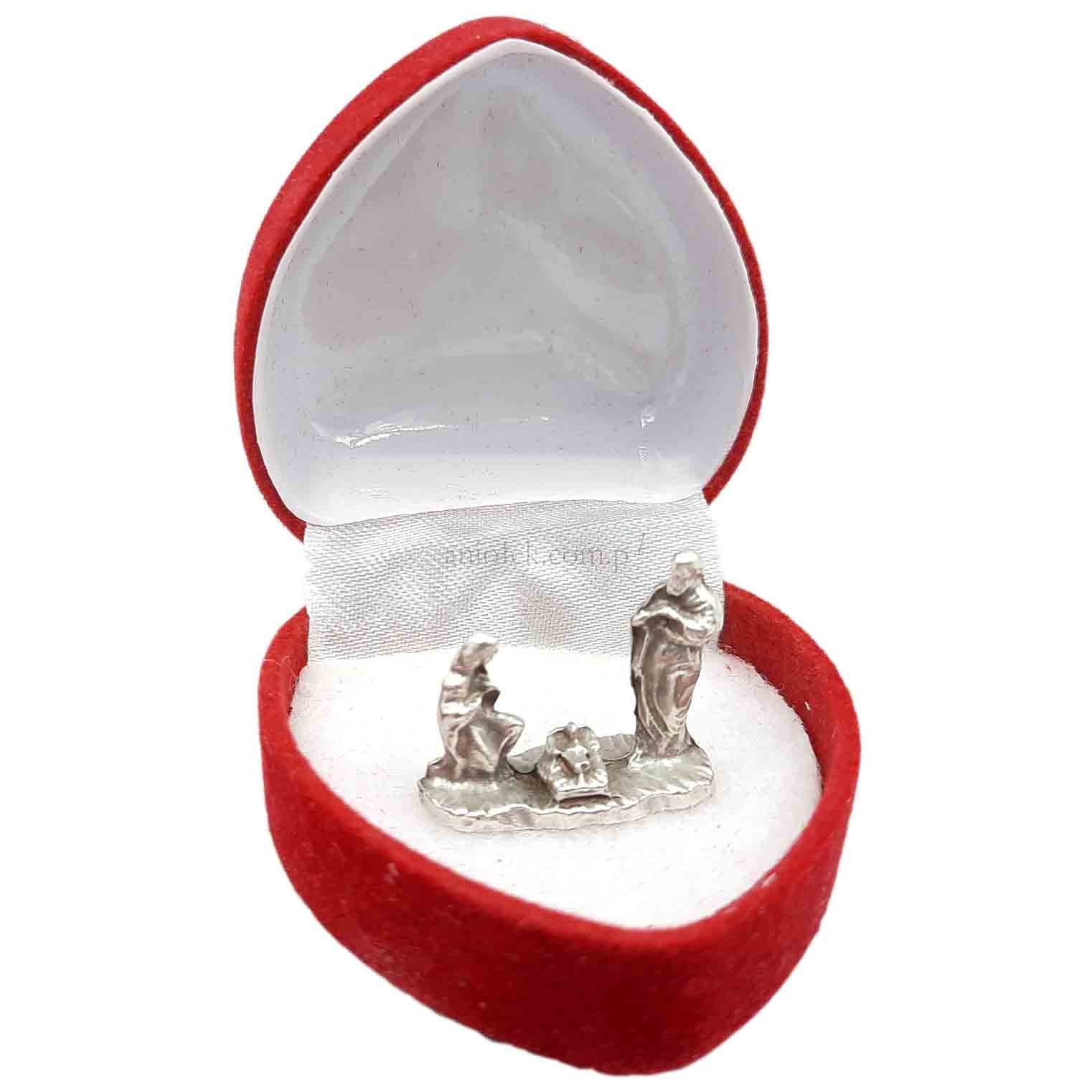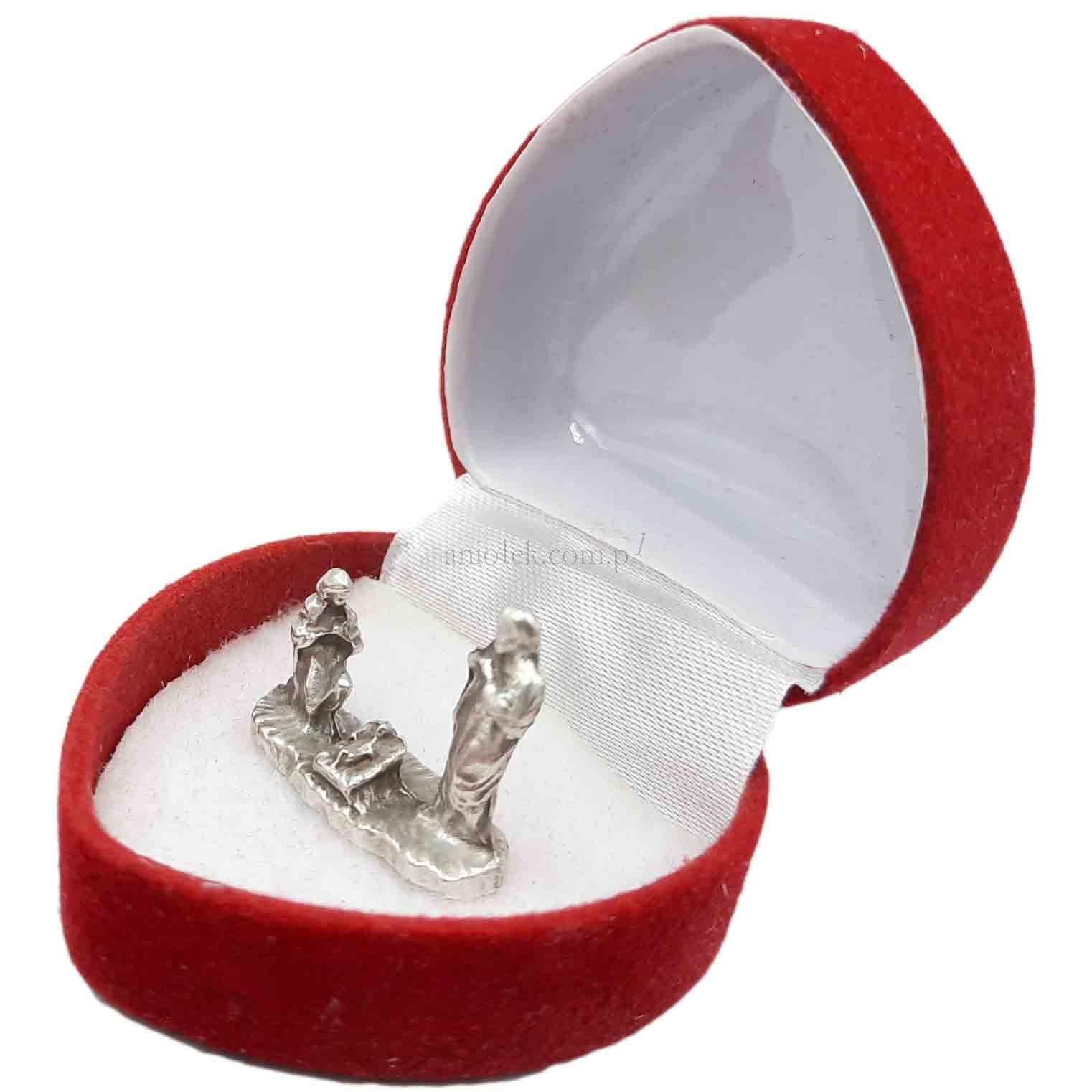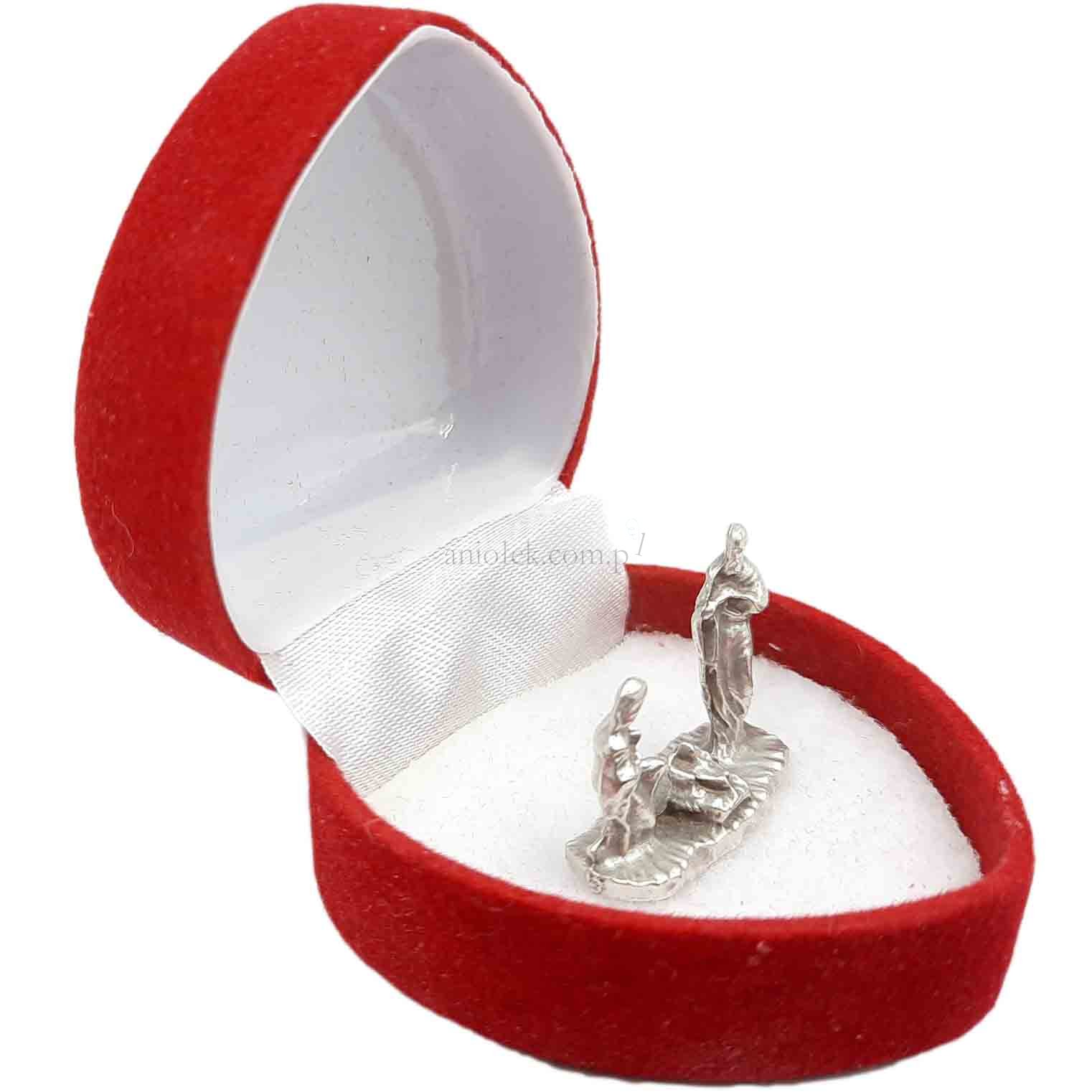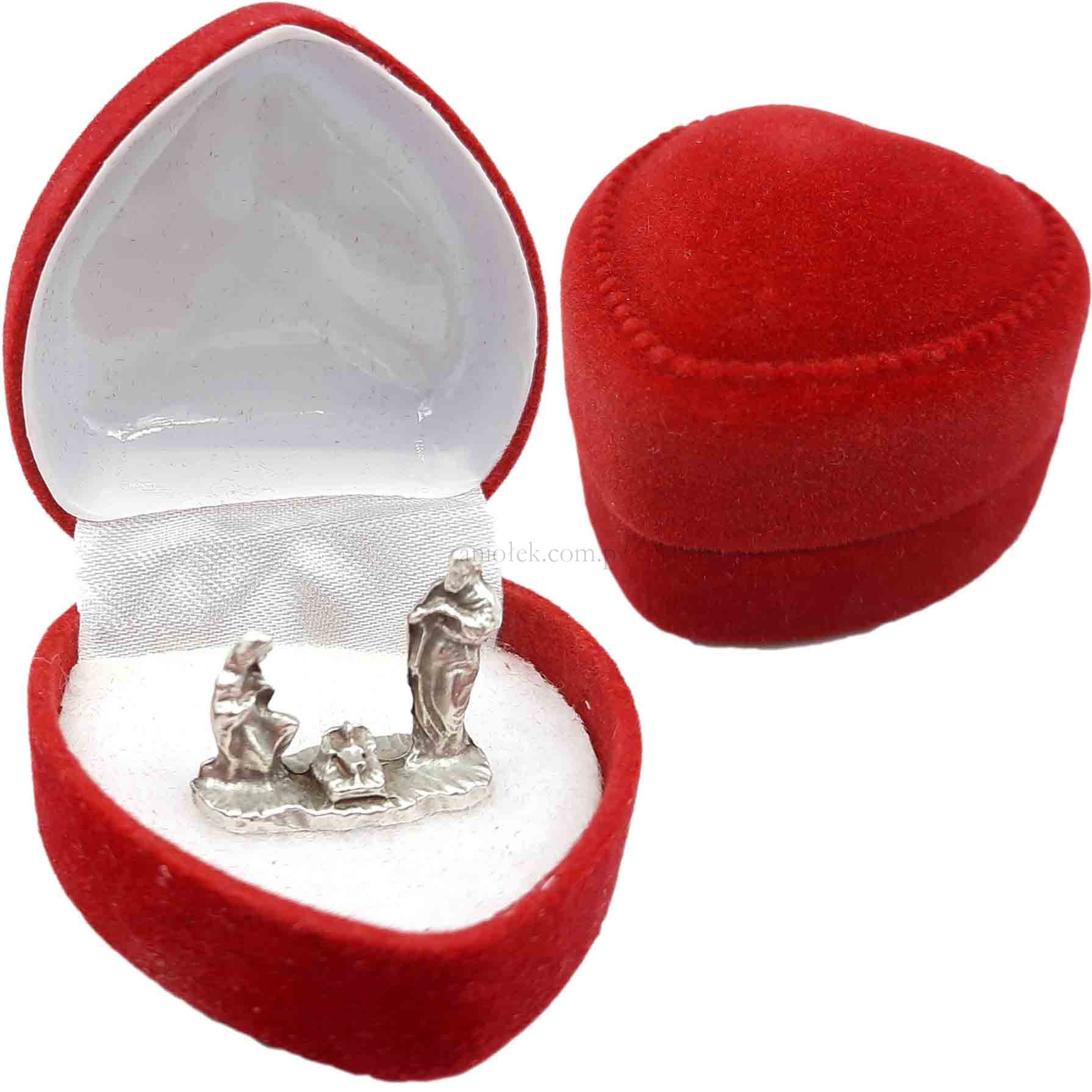 Malutka, metalowa figurka przedstawiająca św. Rodzinę umieszczona w eleganckim pudełeczku biżuteryjnym.