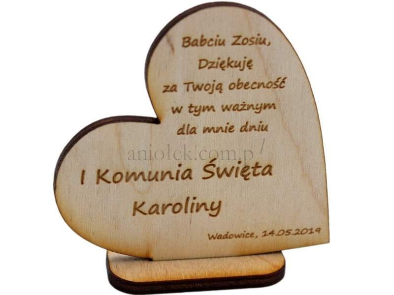 Grawerowane, drewniane winietki w kształcie serca na których umieścimy dla Państwa tekst podziękowania poprzedzony danymi gościa (np. "Ciociu Aniu, Dziękuję za Twoją obecność w tym ważnym dla mnie dniu").