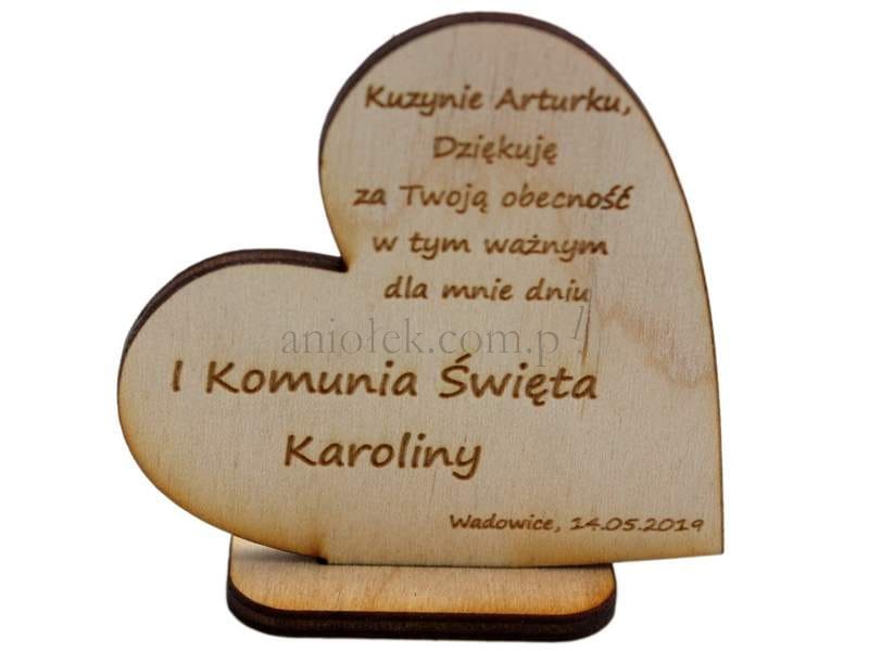 Drewniane winietki na I Komunię Świętą z tekstem podziękowania.