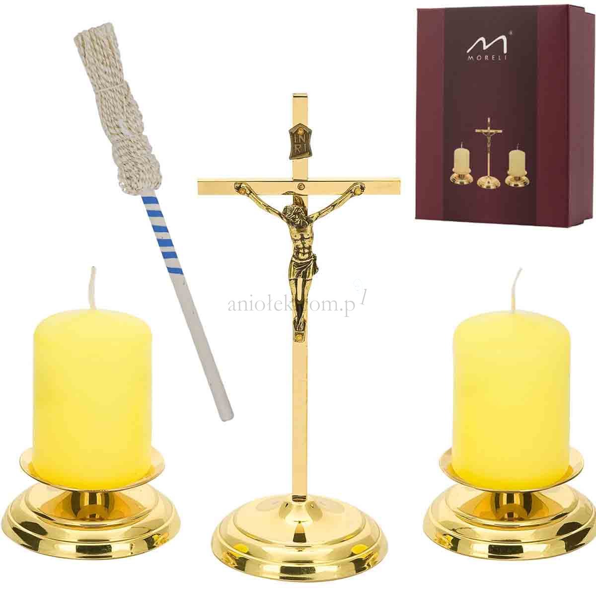 Ekskluzywny zestaw kolędowy, wykonany z metalu mosiądzowanego w eleganckim złotym kolorze, łączący nowoczesny design z wyrafinowaną prostotą. Zestaw zawiera stylowy krzyż, dwa świeczniki oraz białe świeczki. Całość zapakowana jest w eleganckie pudełko, idealne na prezent.