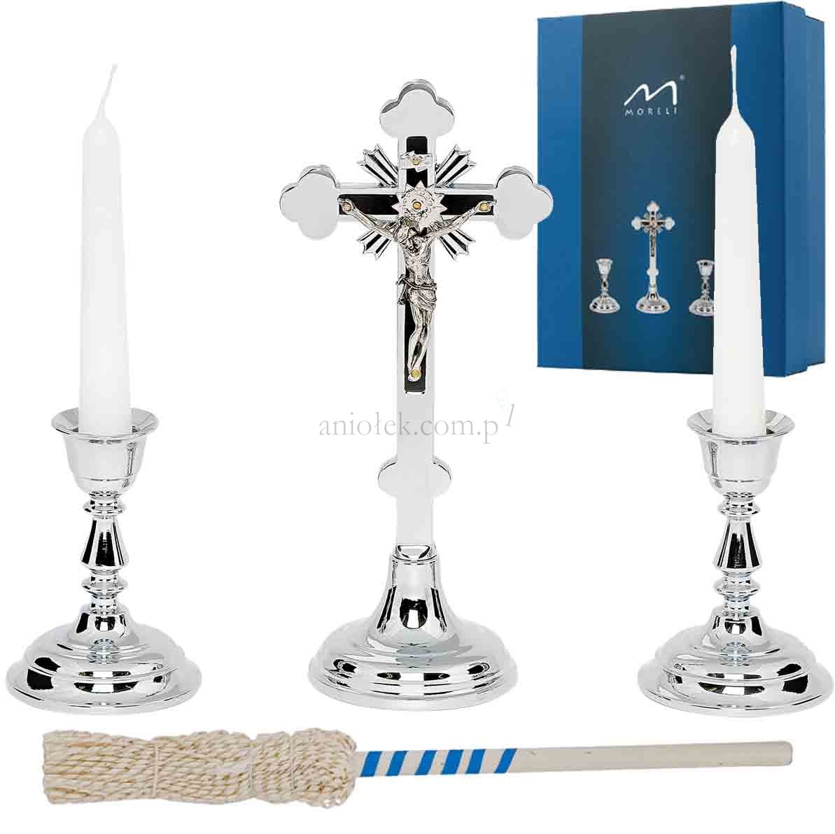- Elementy zestawu: Krzyż, dwa świeczniki, dwie świeczki, drewniane kropidło