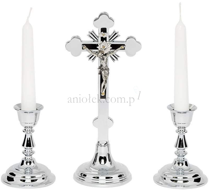- Dwa Chromowane Świeczniki: Perfekcyjnie komponują się z krzyżem, dodając całości harmonii i uroku.